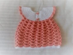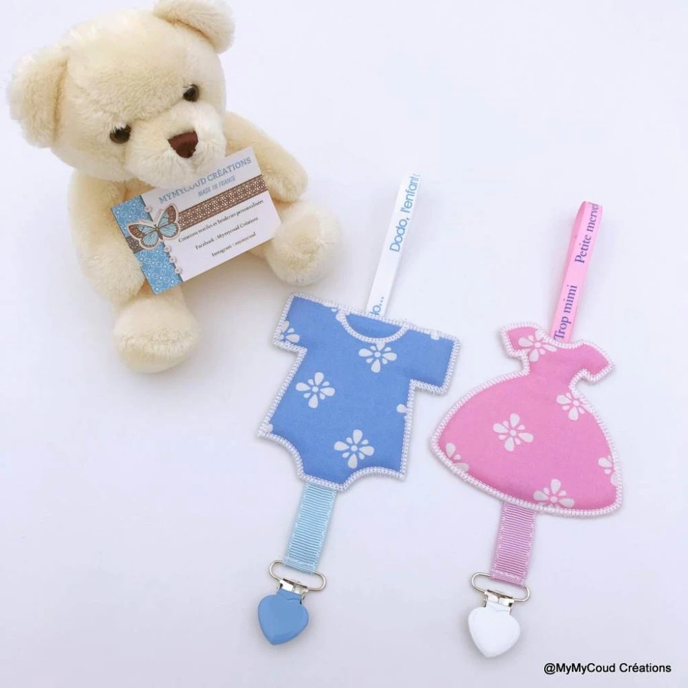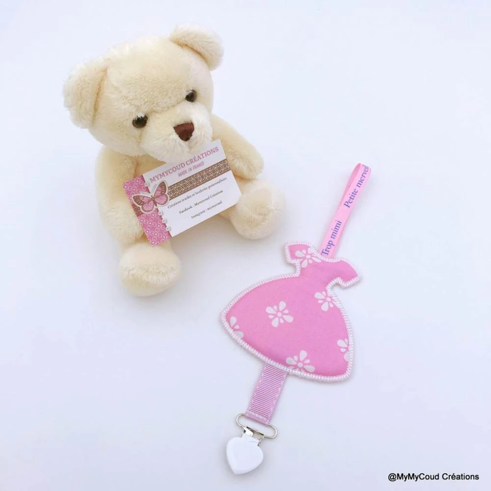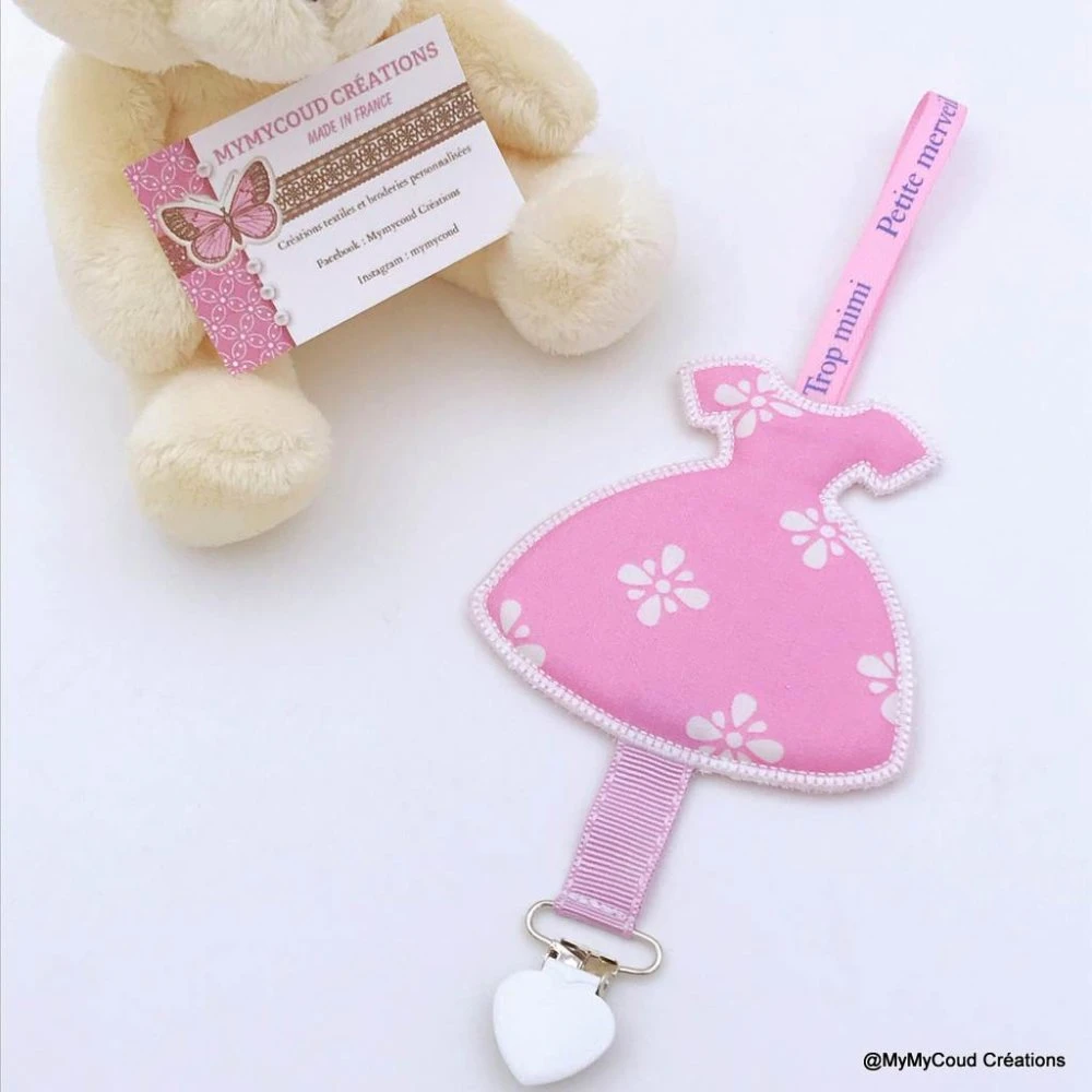 Original et pratique cet attache-tétine en forme de robe confectionné en coton rose et blanc.