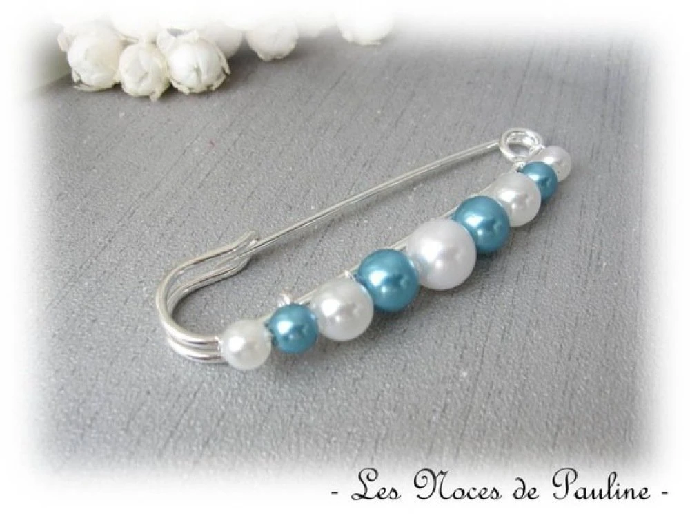 Broche / attache-traîne réalisée à partir d’une base argentée et agrémentée de perles nacrées blanc Neige et turquoise foncé de 6, 8 et 10 mm de diamètre.