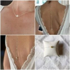 Parure Collier De Mariage Et Bracelet, Collier De Dos, Robe Ouverte En Acier Doré,nacrées Rondes De Swarovski Et Pendentif En Zirconium.