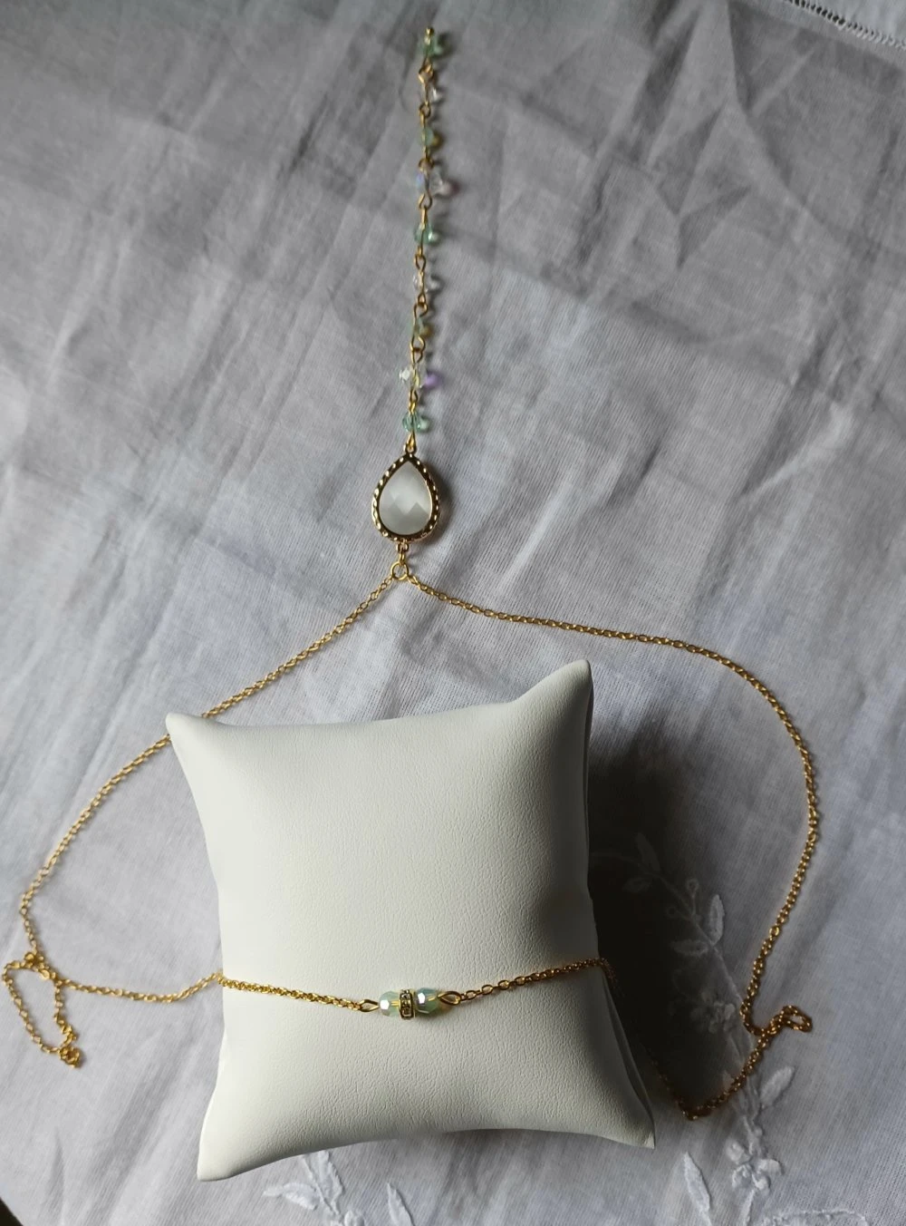 Collier de dos pour sublimer une robe à dos nu, bijou de dos conçu avec une chaîne dorée fine et solide en acier inoydable, jolies perles en cristal incolore avec serti doré assorti et gouttes en cristal.