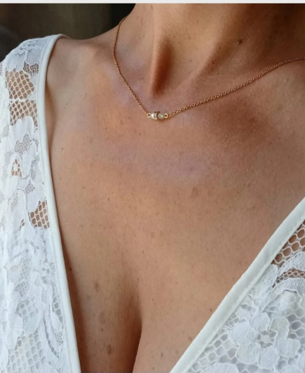la chaîne de dos se positionne dans le fermoir du collier, grâce à un petit anneau que l’on fixe dedans.
