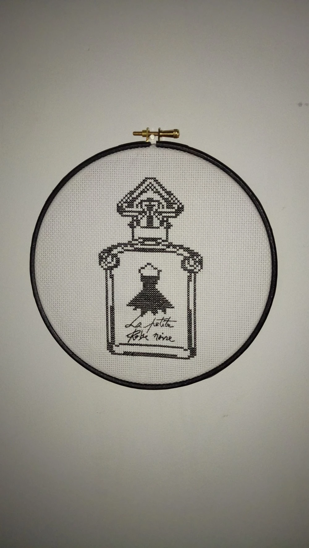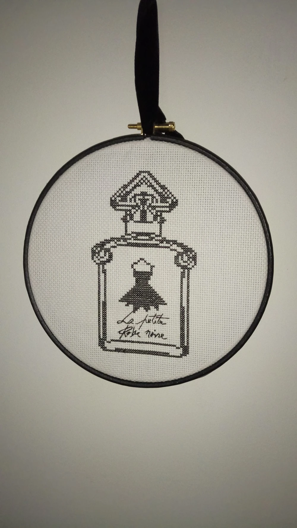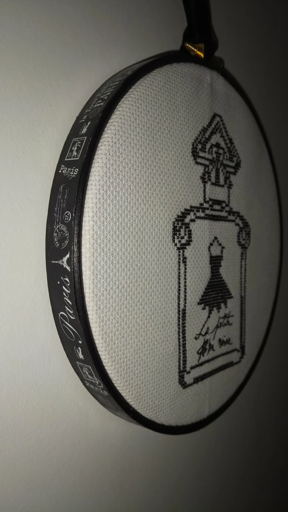 Broderie confection main,cerclée dans son tambour en bois que j’ai peint en noir et recouvert d’un ruban masking-tape sur le thème « Paris » dans l’esprit du cadre.