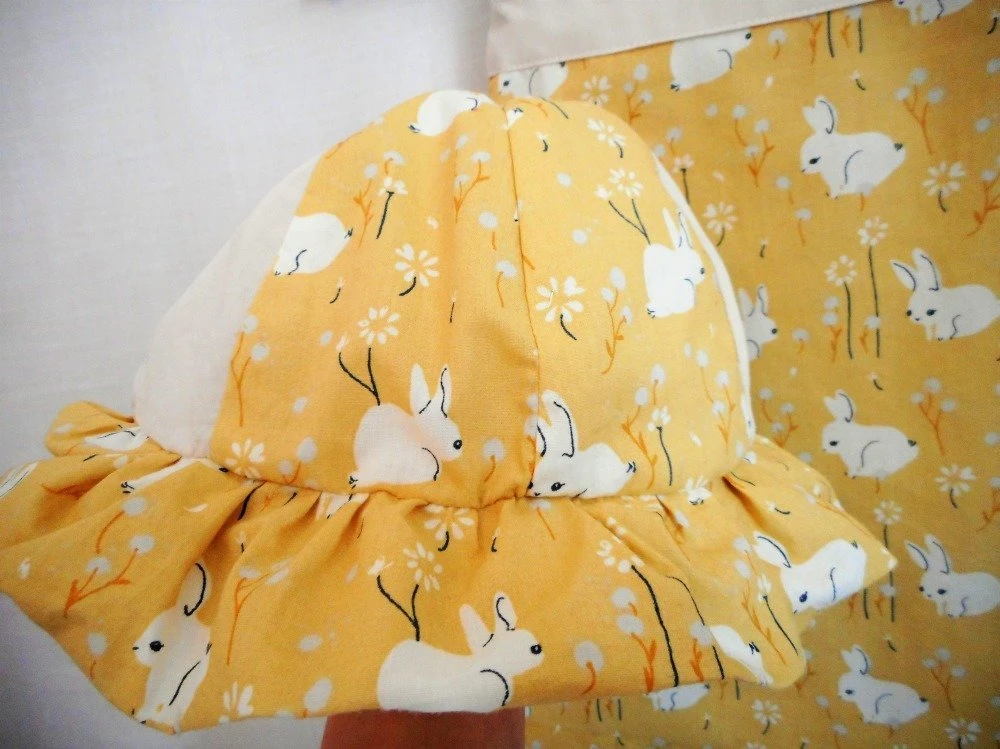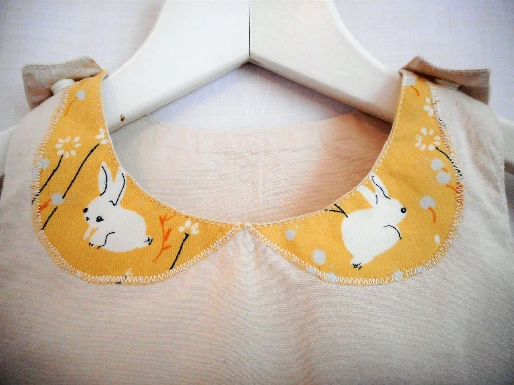 Le reste de la robe ainsi qu’un faux-col Claudine, sont en coton biologique imprimé de lapins blancs sur fond jaune.