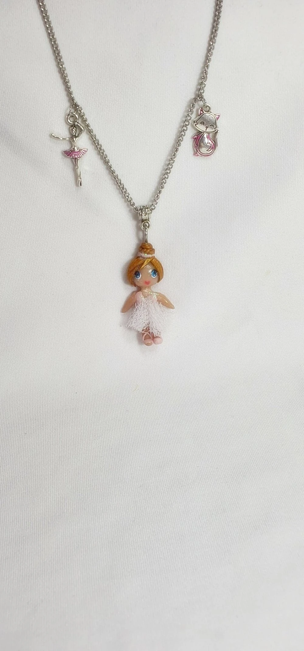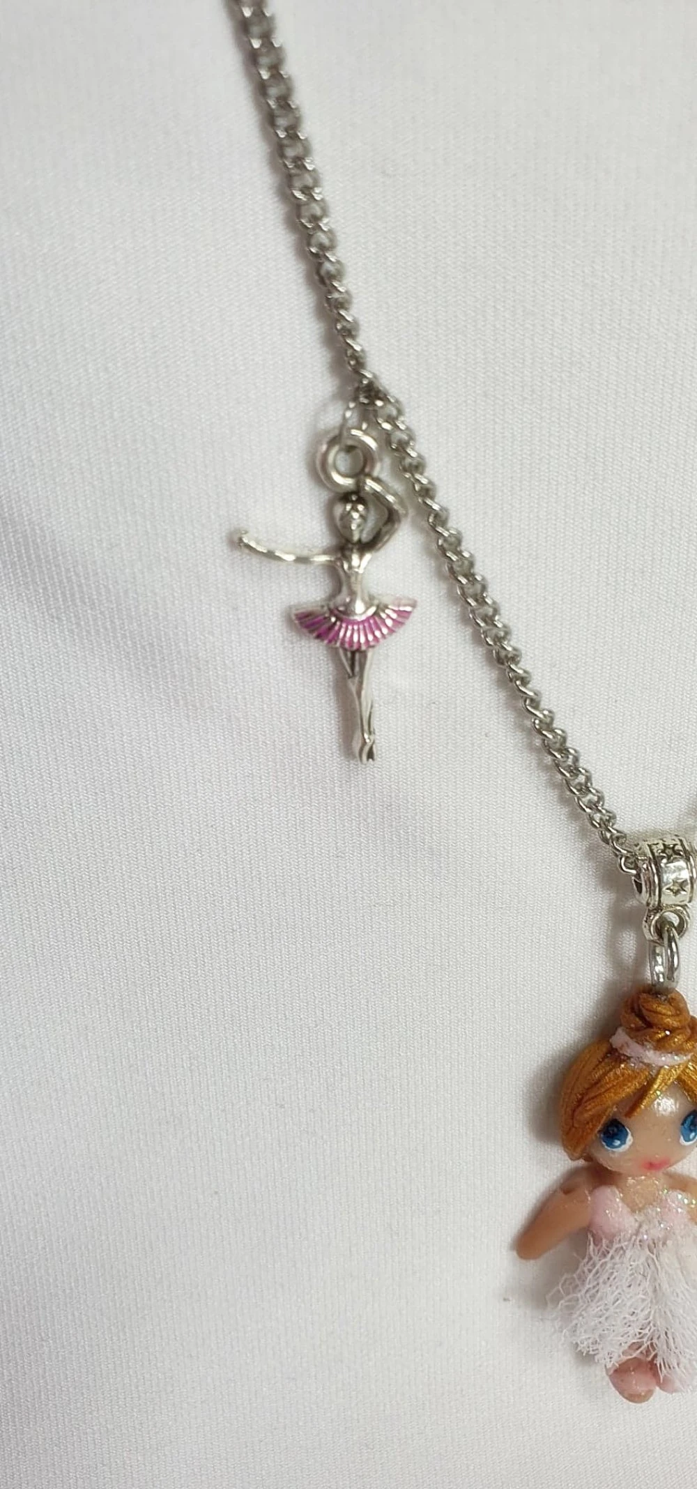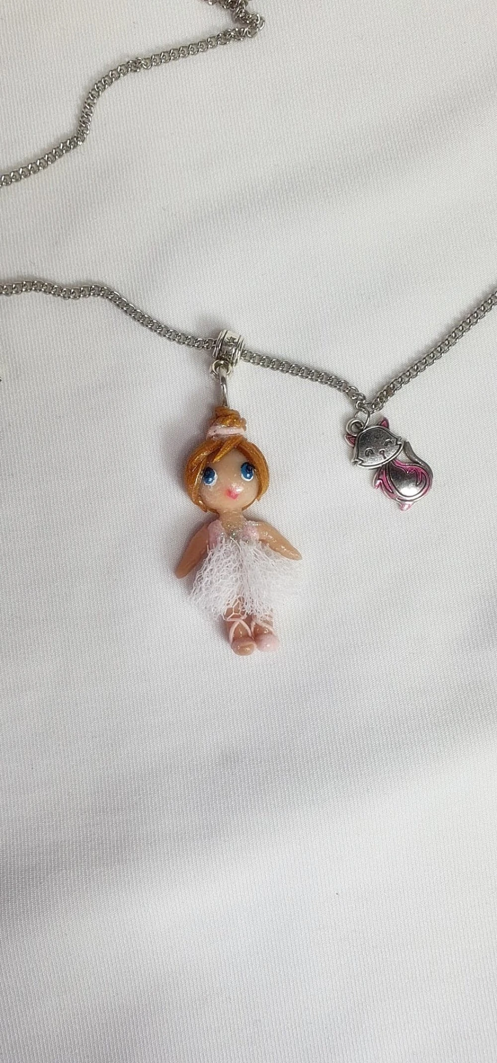 La ballerine est accompagnée d ‘un chat et d’une petite ballerine, le tout monté sur une chainette de qualité en acier inoxydable