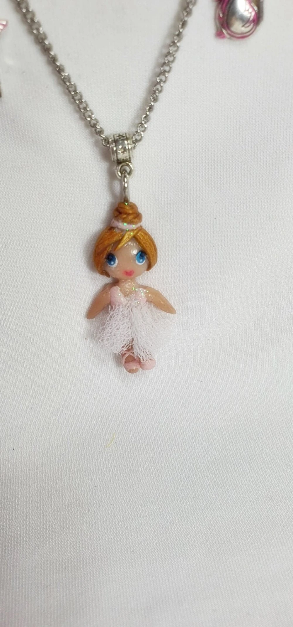 Collier fillette en robe de ballerine, justaucorps rose, tutu en en véritable tulle blanc Petite poupée aux yeux bleus, bouche en forme de cœur, petit chignon avec un chouchou en velours rose