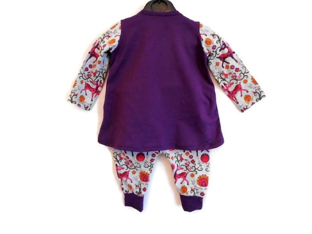 Ensemble pour bébé fille taille 12 mois, ensemble très confortable grâce aux matières élastiques et naturelles, tenue parfaite pour la fin de l’hiver, le printemps.