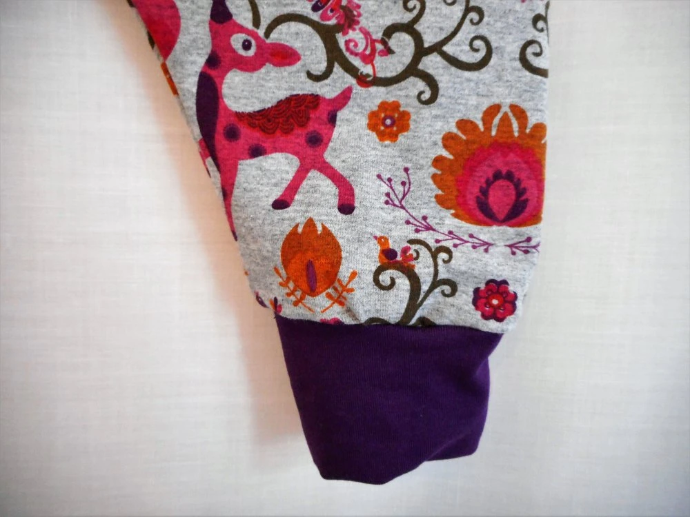 Les empiècements (chevilles, ceinture) sont réalisés dans le jersey de coton biologique violet. Il y a un élastique dans la ceinture.