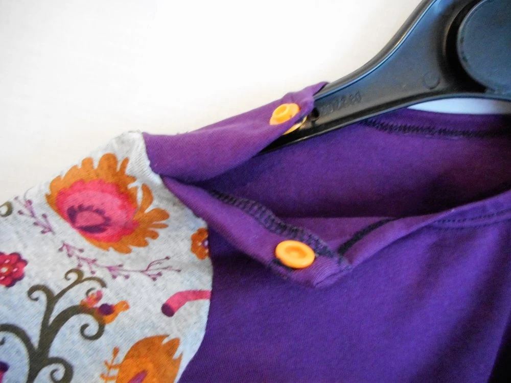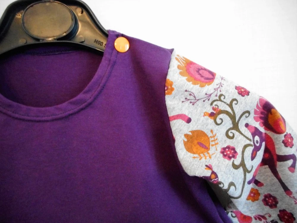 Robe-tunique manches longues, le corps est réalisé en jersey de coton biologique violet, les manches sont réalisées dans un jersey de coton imprimé de cerfs, violet, orange et fuchsia sur fond gris chiné avec des oiseaux et fleurs dans les mêmes couleurs, l’encolure s’ouvre au niveau des épaules avec des pressions KAM (anti-alergène) orange.