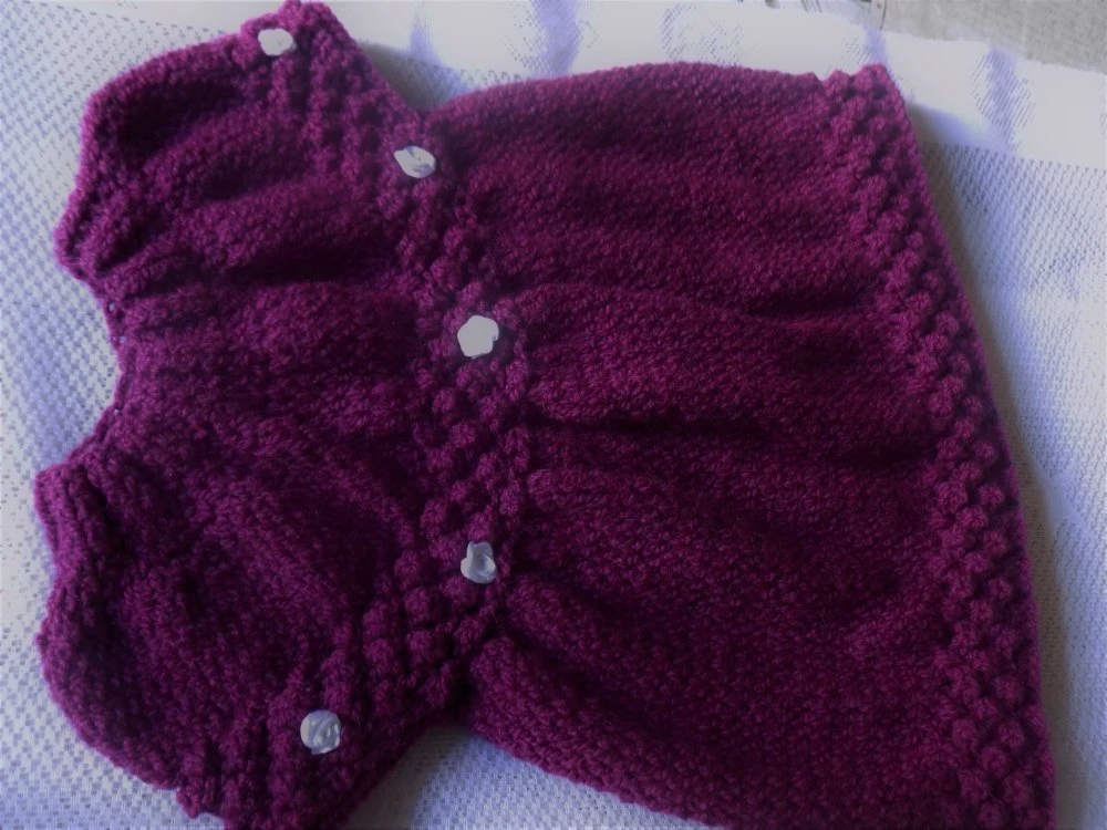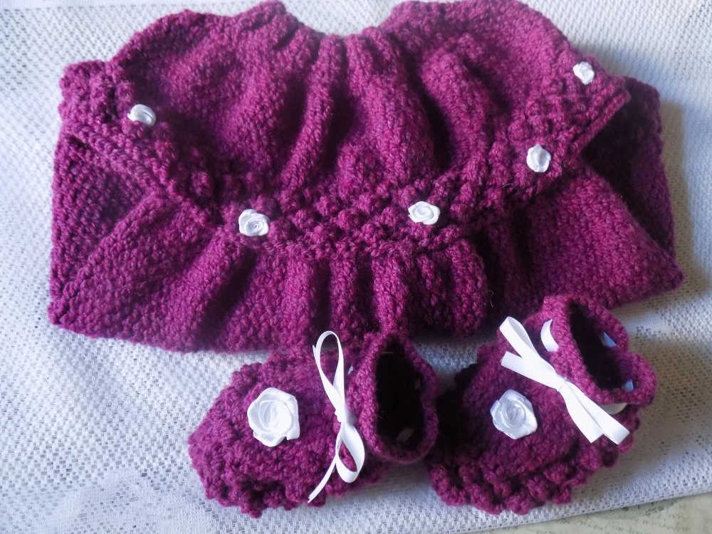 _Ravissant petit ensemble pour bébé composé d’une robe et d’une paire de chaussons réalisé au tricot en laine layette acrylique de coloris prune en taille 3 mois,selon le poids et la taille de l’enfant,pensez à vérifier les mensurations de bébé avant de commander.