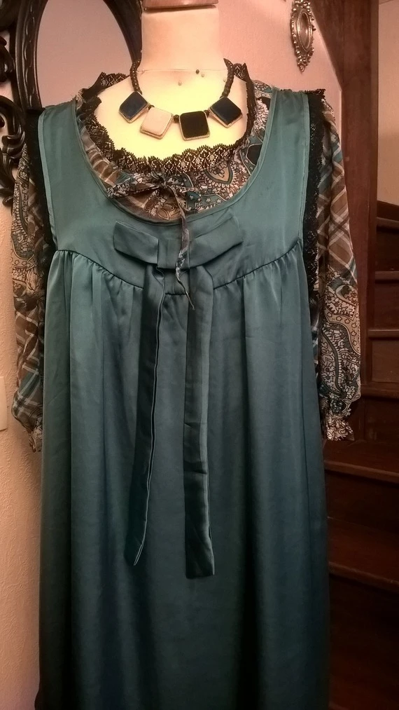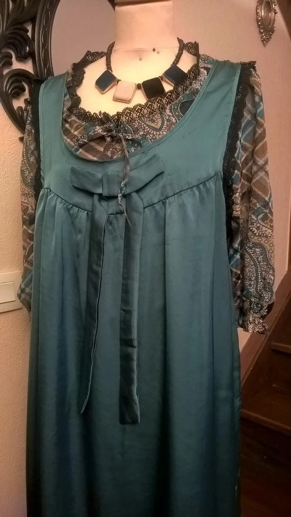 Ensemble robe en satin bleu canard et blouse en mousseline imprimée