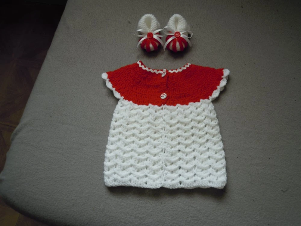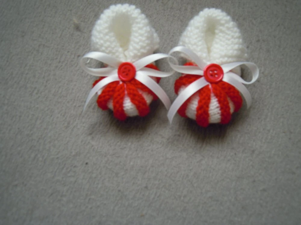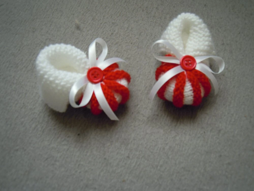 Une petite paire de chaussons de couleur assorti et tricoté main complète cette tenue.