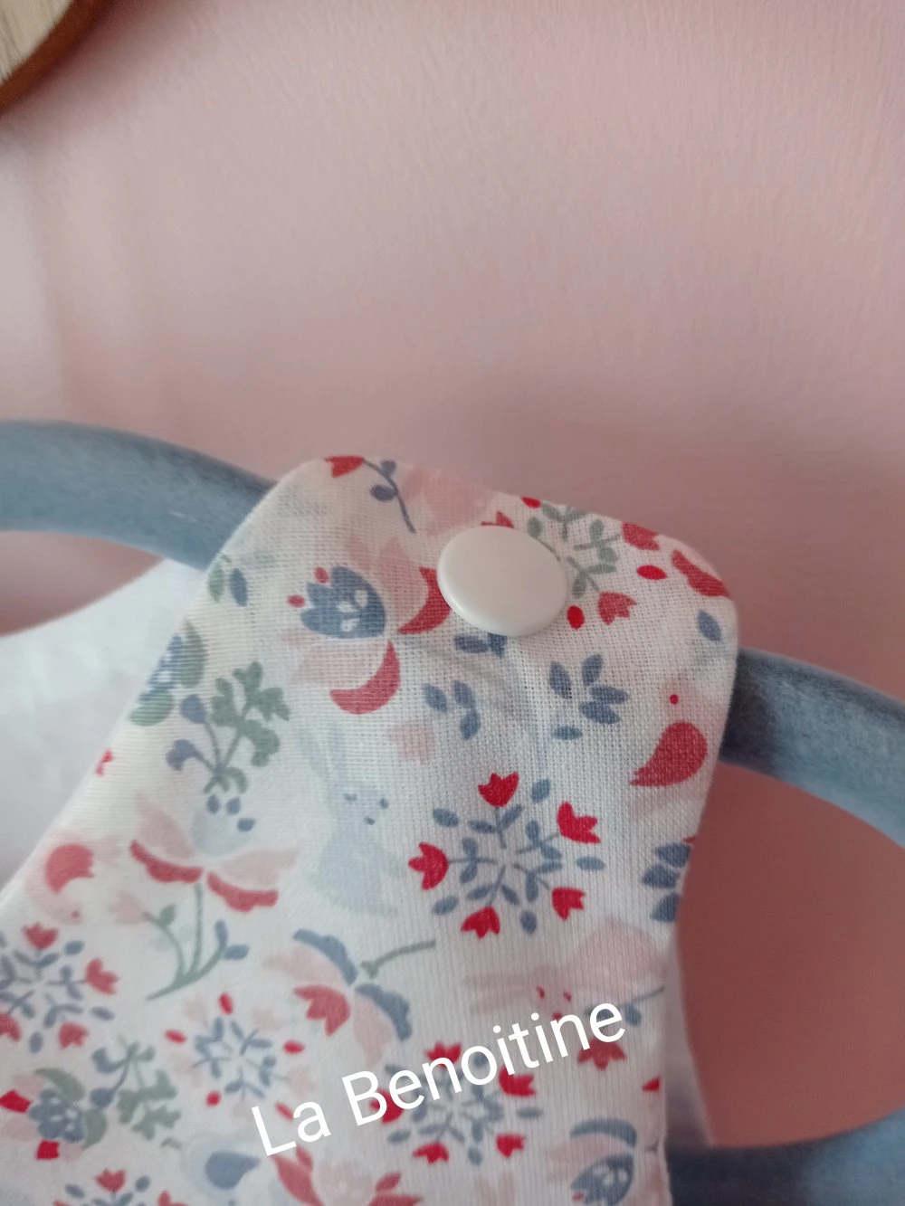 Le tissu imprimé est un tissu 100 % coton ; il est léger et doux. Dans des tons de roses et bleus sur fond blanc, les motifs sont délicats et représentent des fleurs, des lapins (2 x 1 cm) et oiseaux.