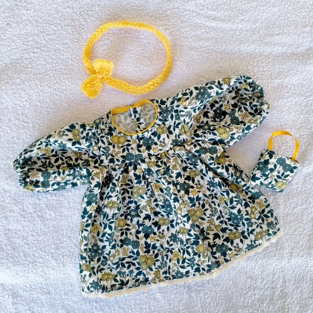 – une robe à manches longues en fin lainage Liberty à fleurs vertes et jaunes. La robe est ornée d’une petite dentelle de coton à l’ourlet. Elle se ferme au dos par du velcro, et les manches ont un élastique au poignet,