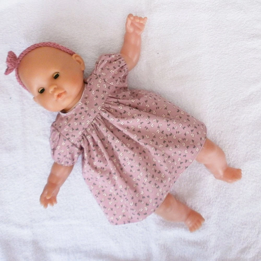 Une jolie robe en coton couleur vieux rose imprimé de petites fleurs, avec manches ballons élastiquées. La robe se ferme au dos par du velcro (enfilage facile).
