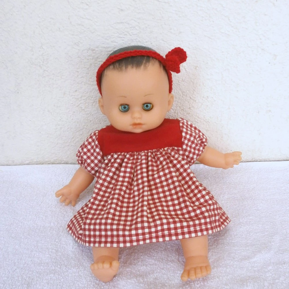 Vêtements de poupon : une jolie robe et son bandeau, pour poupon Petit Câlin (28 cm) de marque Petitcollin.