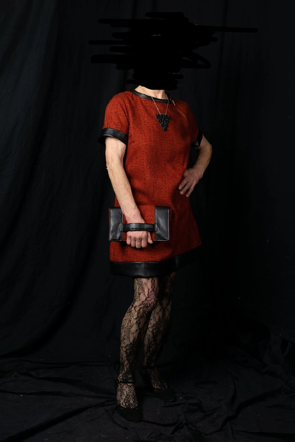 Robe facile à porter en toute occasion ,tissu rouge granité du plus bel effet souligné de simili cuir noir autour du coup, des emmanchures et bas de robe , pour plus de classe fermé par une fermeture éclair décorative .