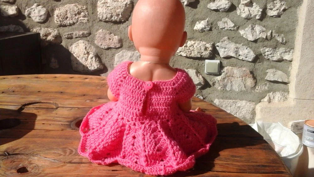 Petites robe réalisé en laine au crochet pour bébé ou poupon 40 45 cm de couleur claire robe évasé avec un bouton au dos autre couleur possible sur demande n’hésitez pas à me contacter pour toutes questions autres article au crochet dans ma boutique en ligne