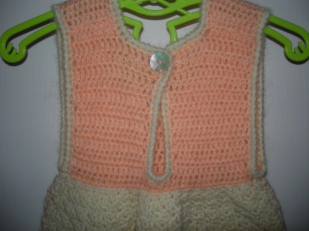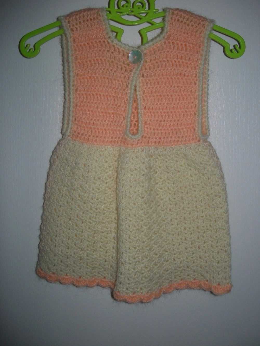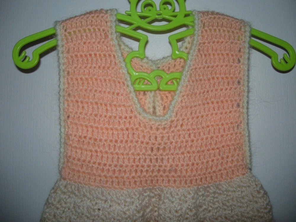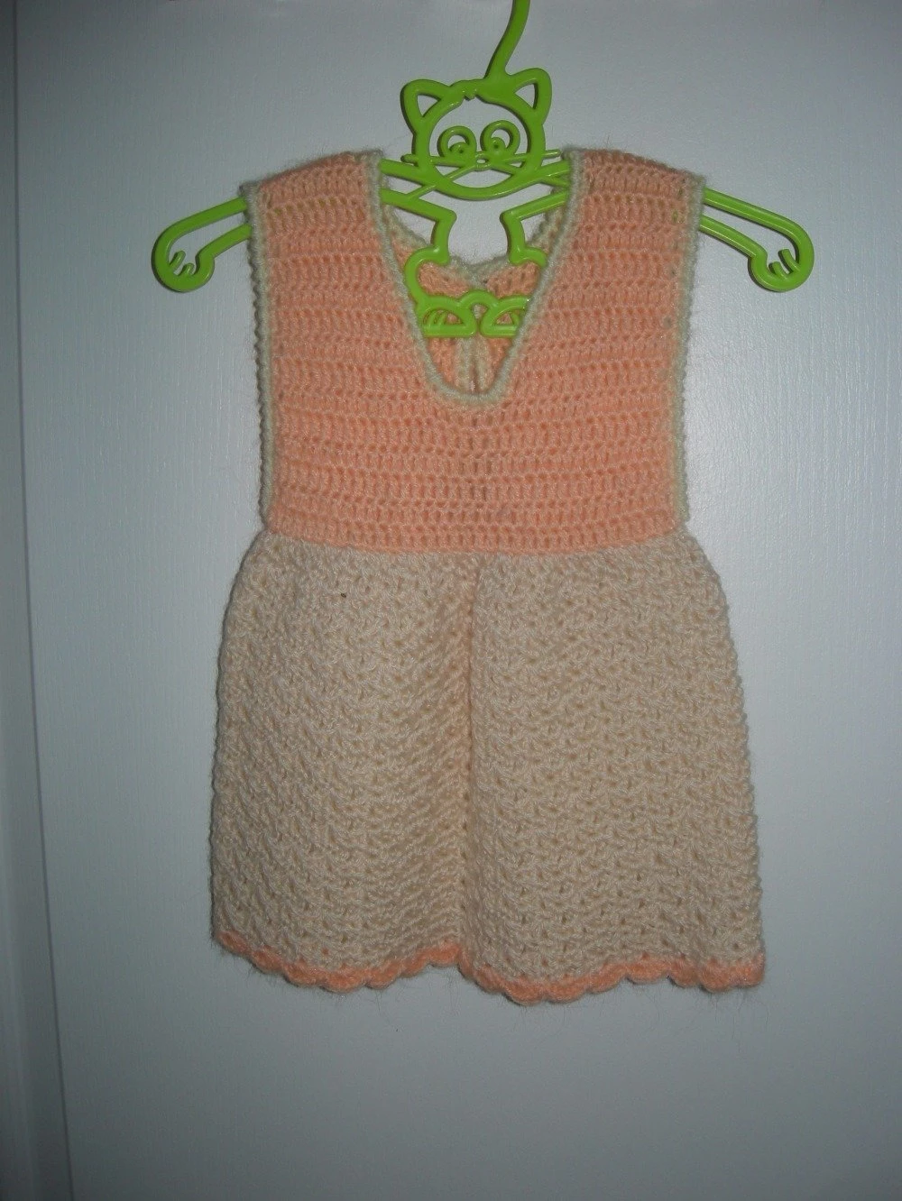 jolie petite robe chasuble réalisée en laine au crochet 2 couleurs : écru et saumon avec un petit liserai tout autour de la robe pour bien la terminer.