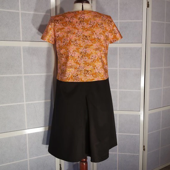 Cette petite robe très simple est une robe trapèze réalisée avec un tissu noir en coton satiné et un joli tissu japonais ocre et doré avec motifs de cerisiers aux fleurs blanches et roses pâles. Ces couleurs chaudes annoncent les beaux jours.