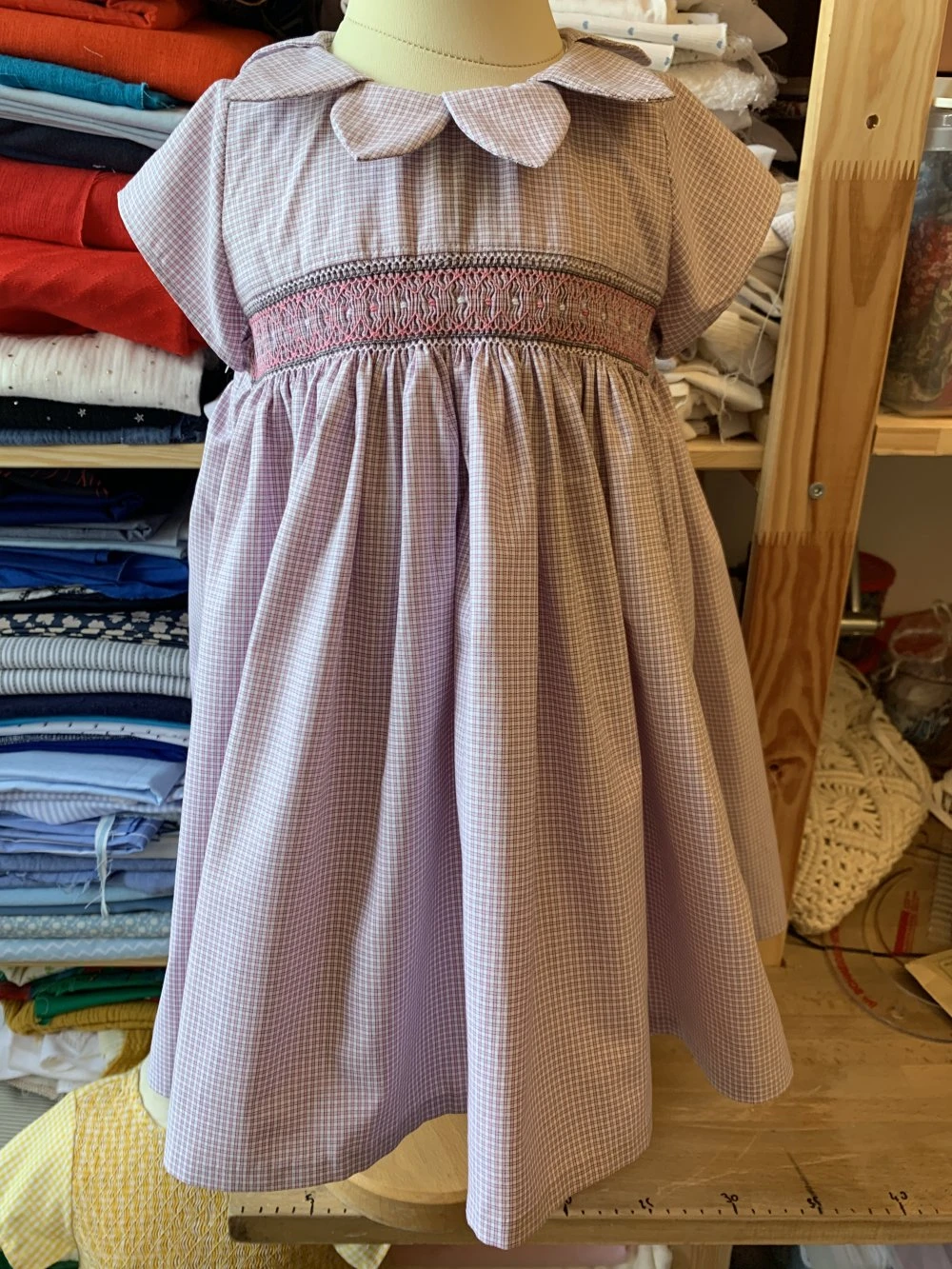 Pour un été tout en élégance robe à smocks petite fille taille 12/18 mois en coton rose blanc et gris de très belle tenue. Smocks entièrement fait main devant. Col feuilles. Boutonnage dos .manches courtes et droites.