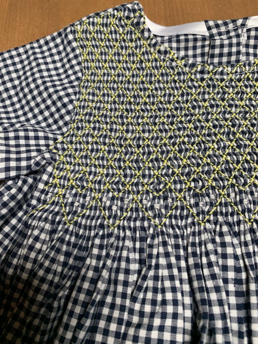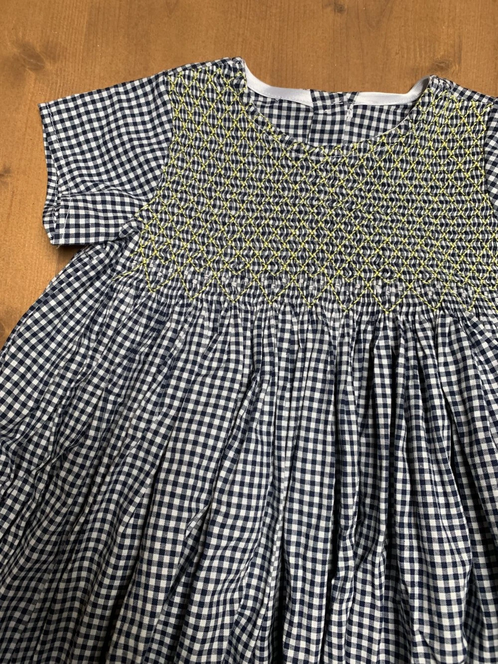En coton vichy marine et blanc robe smockée devant en jaune et blanc dos fermé par boutons nacré jaune encolure ronde manches droites et courtes
