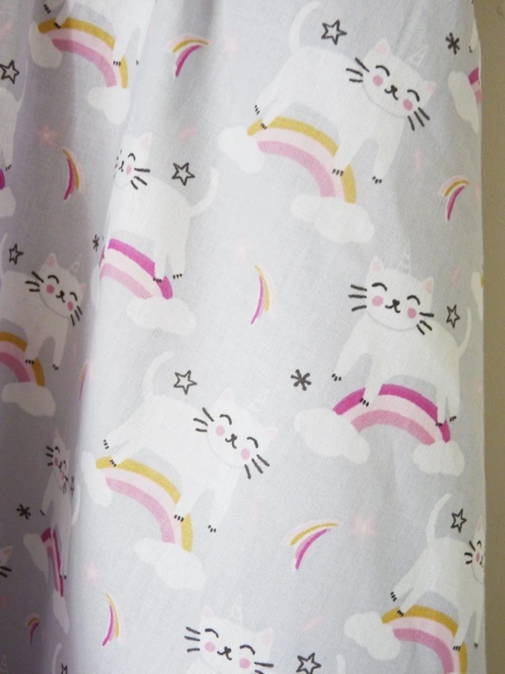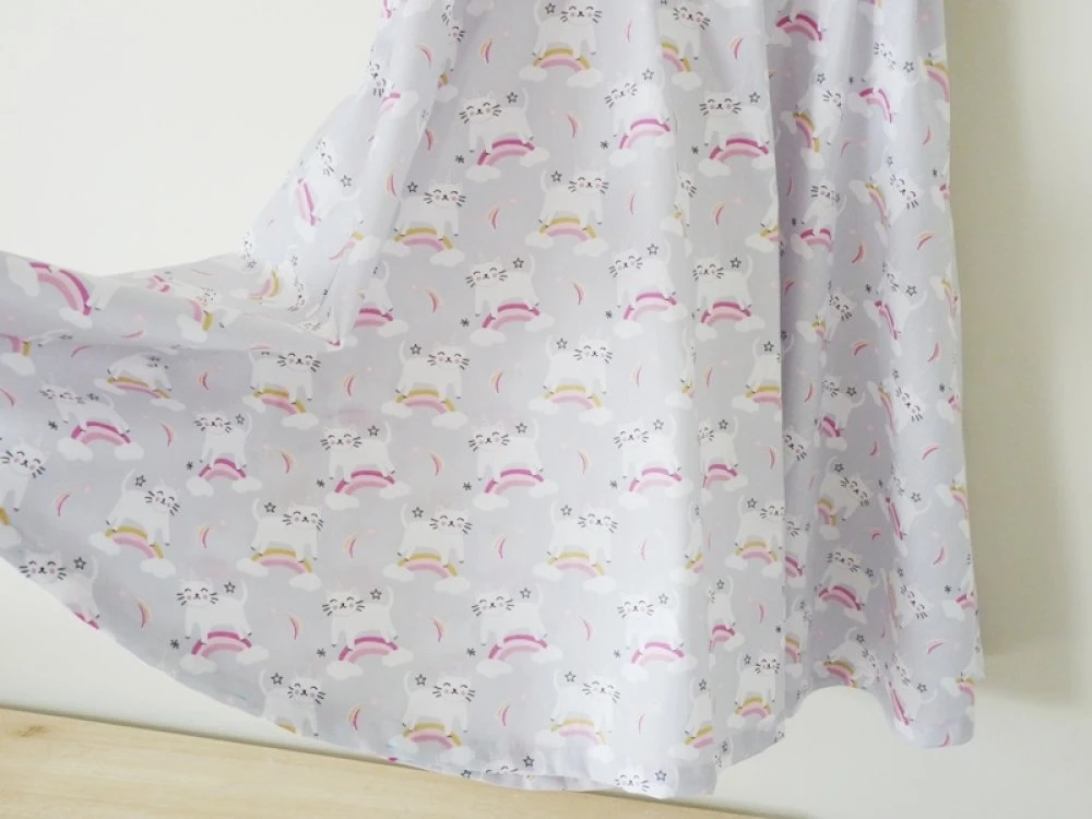 Jolie robe en coton petits chats, arcs-en-ciel et nuages.