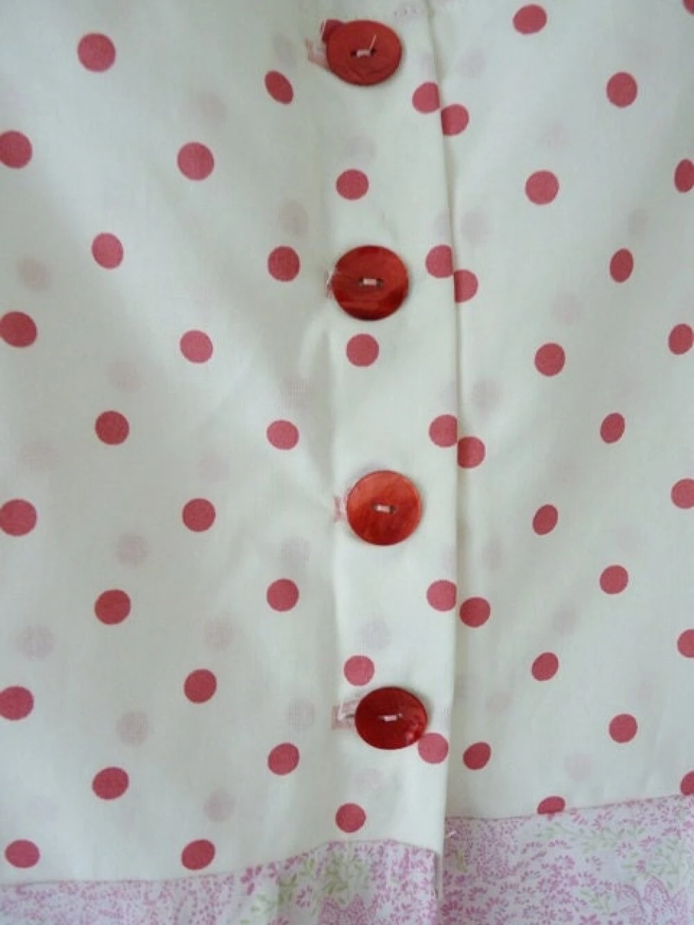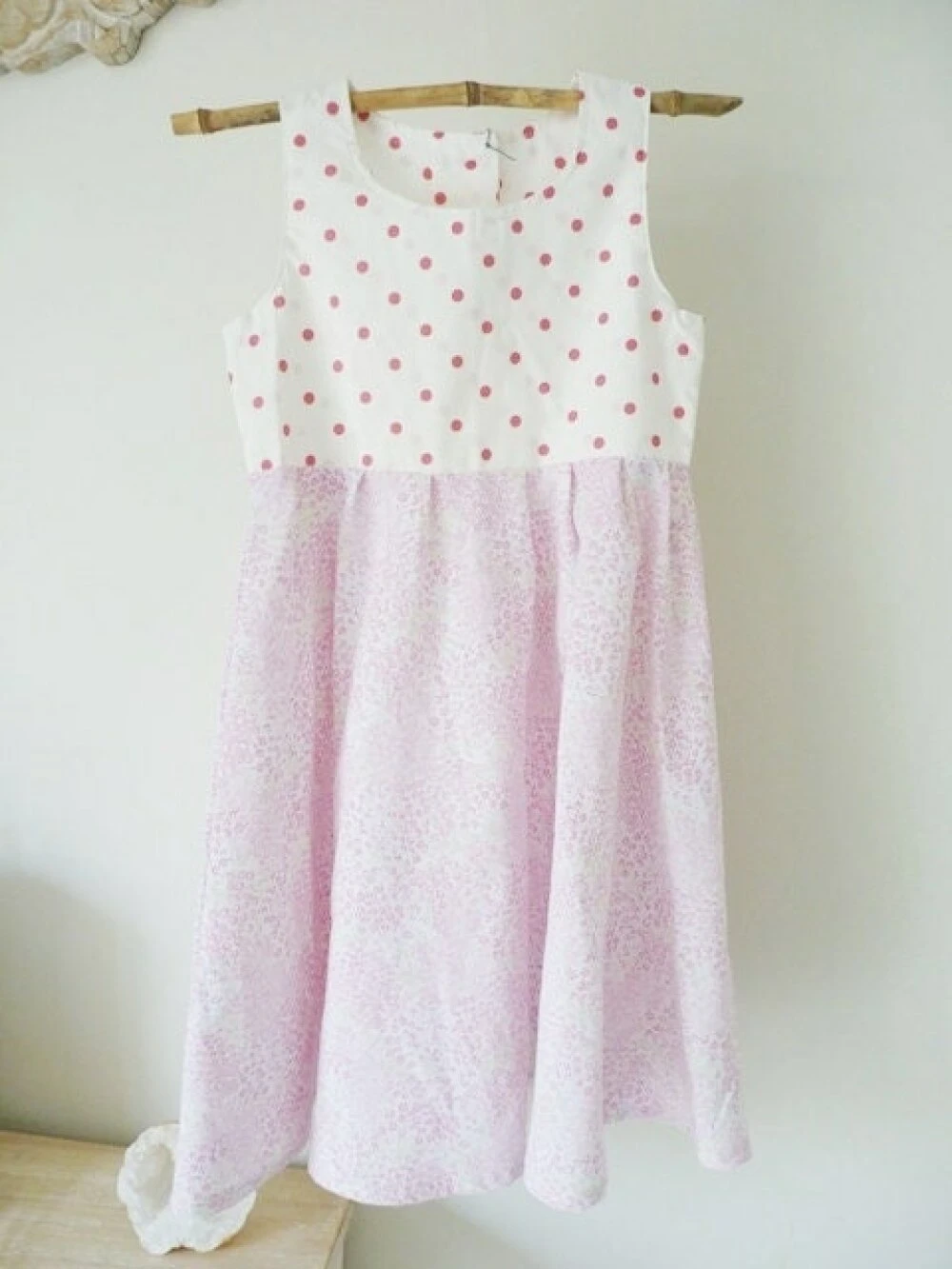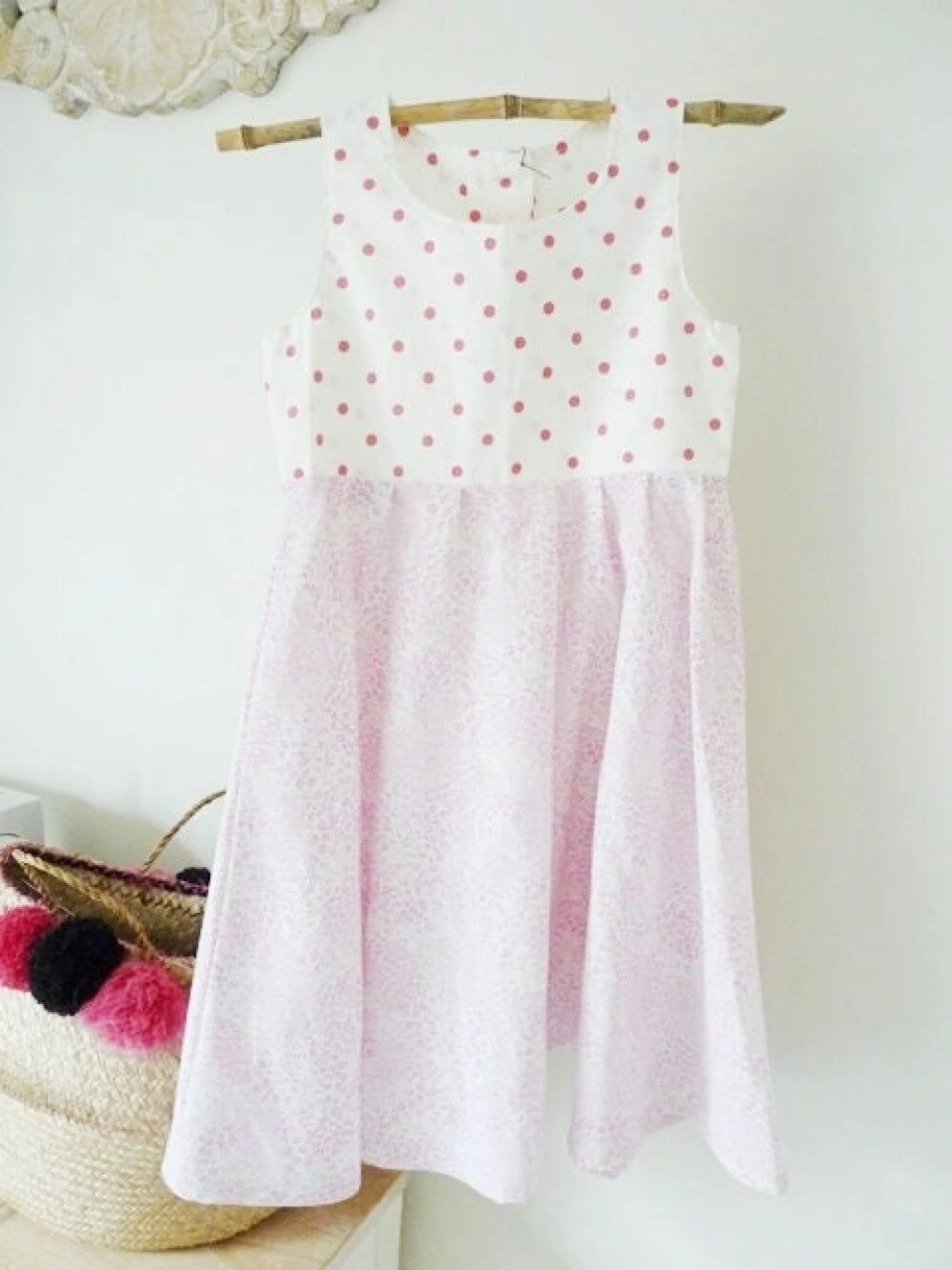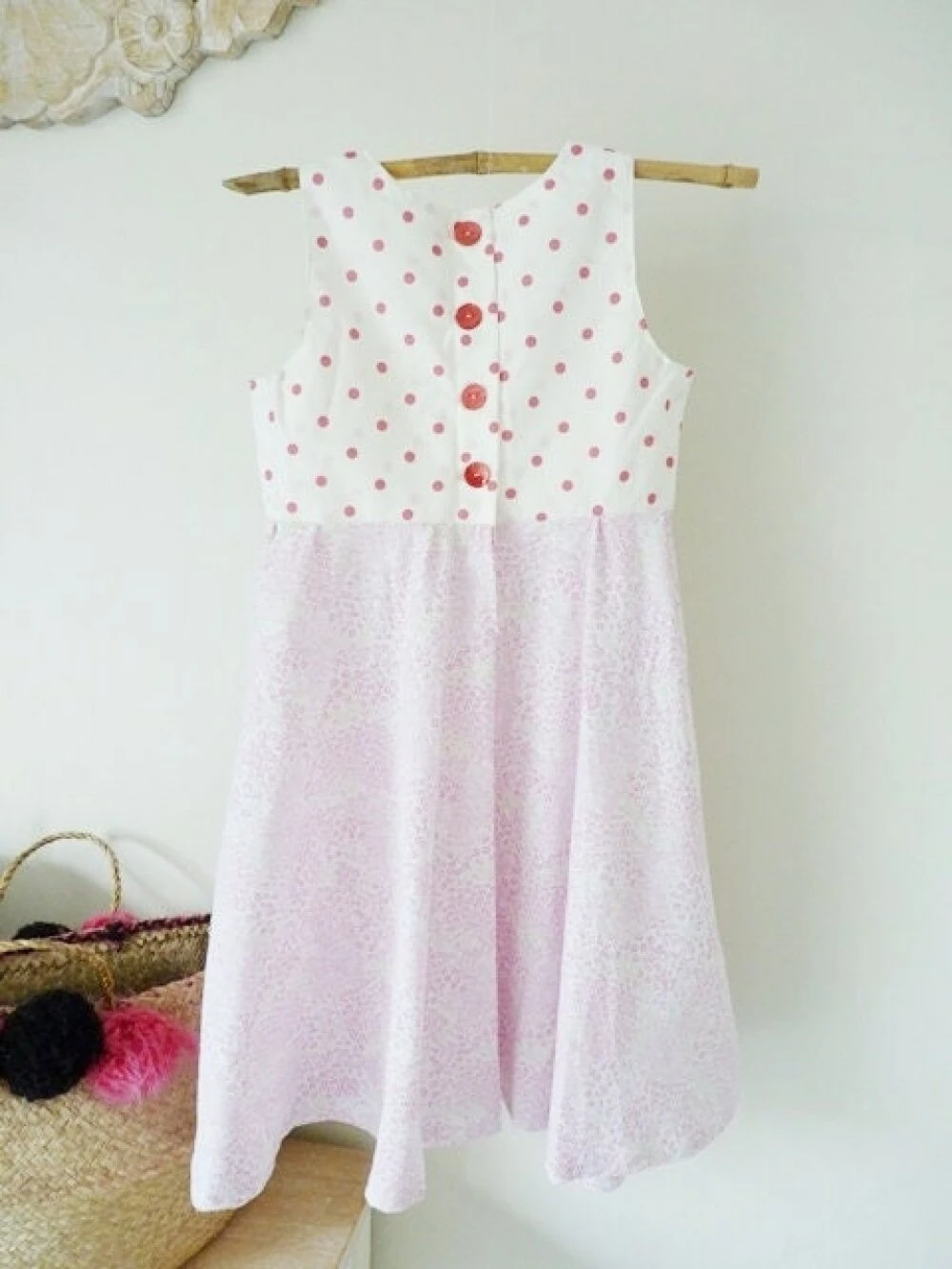 Robe ample en coton liberty rose, vert et blanc et coton à pois rose sur fond blanc.