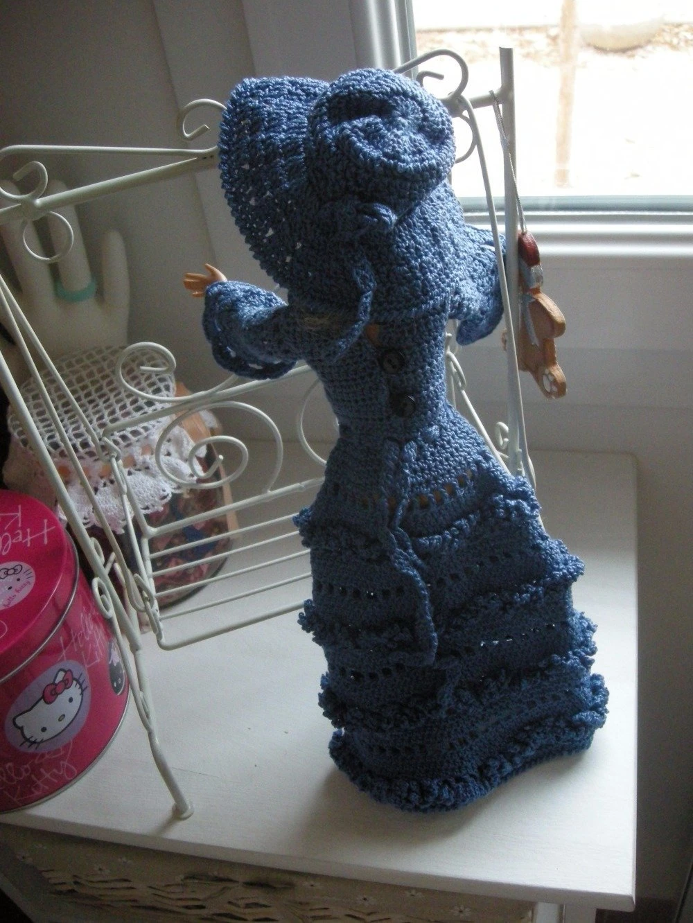 crochetée avec du coton très fin, bel effet, la poupée est élégante avec son chapeau assorti.