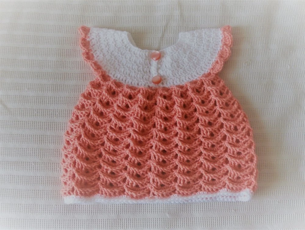 Assortie au bloomer blanc/marine ci-contre, j’ai réalisé cette petite robe à la main au crochet. L’empiècement est blanc et le bas est de couleur saumon. 2 boutons assortis ferment l’encolure au dos.