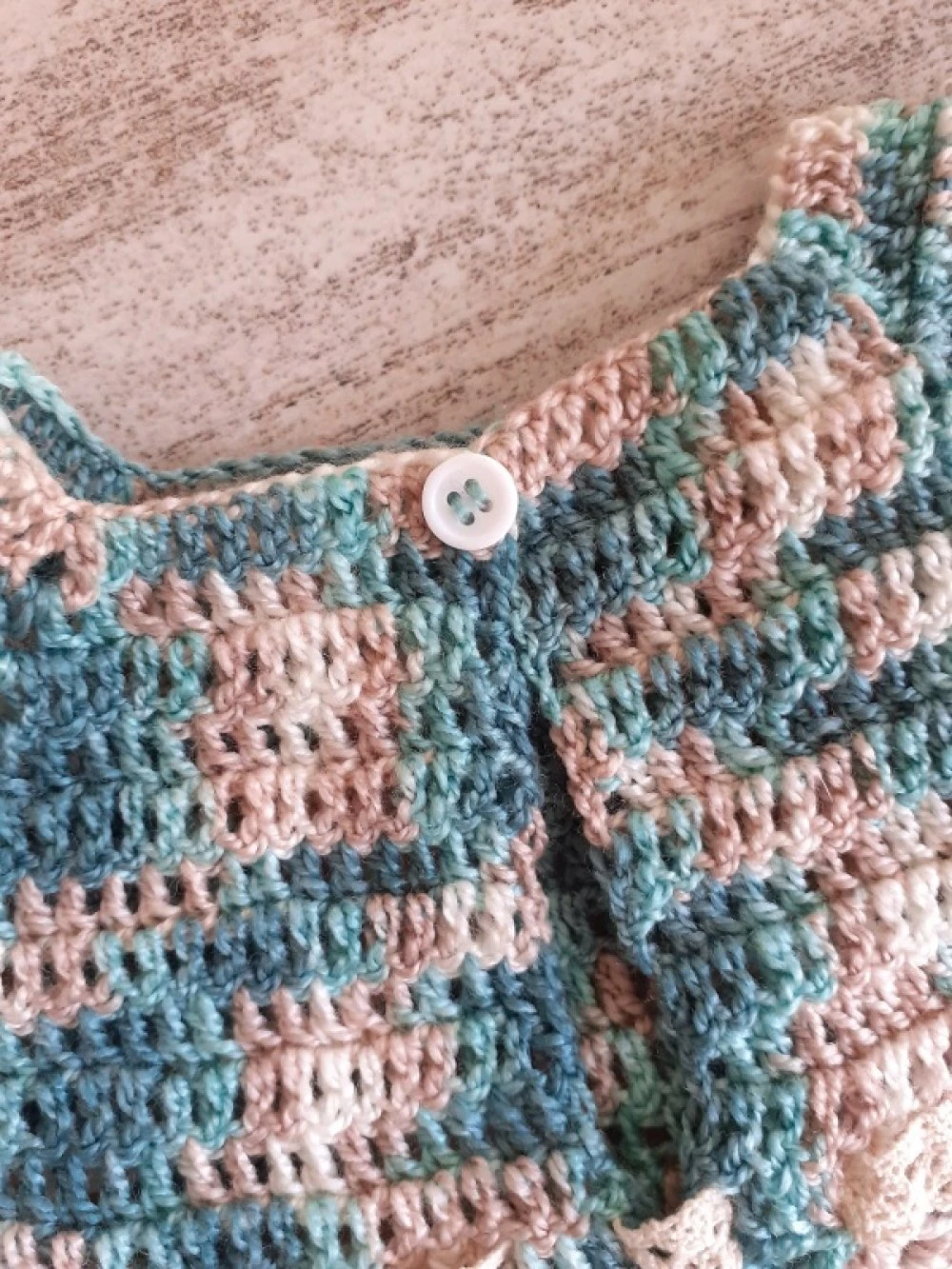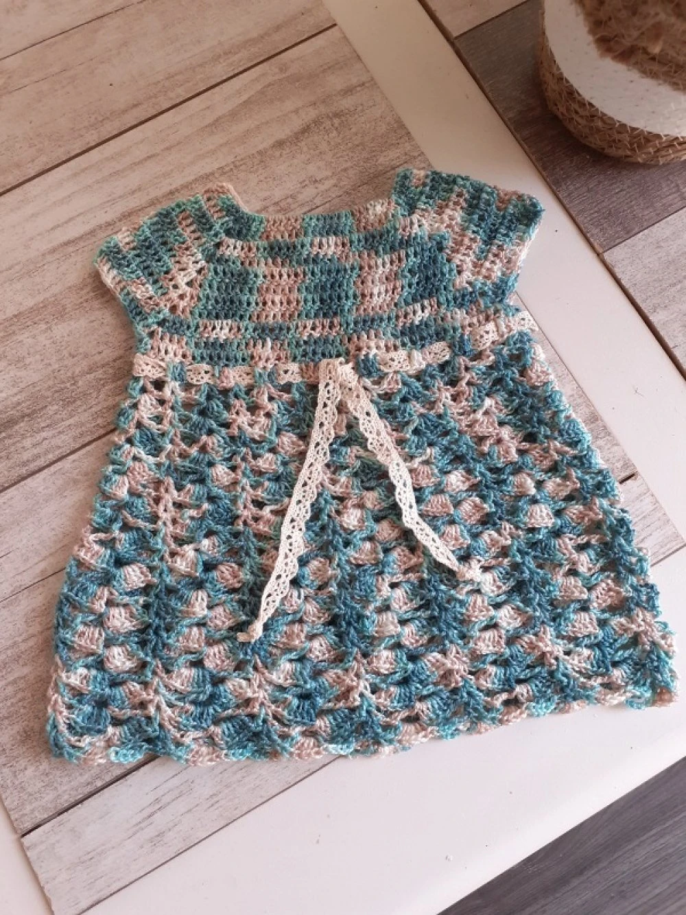 Robe bebe en coton entièrement crochetée à la main par mes soins, fermeture au dos grace a un petit bouton en resine.
