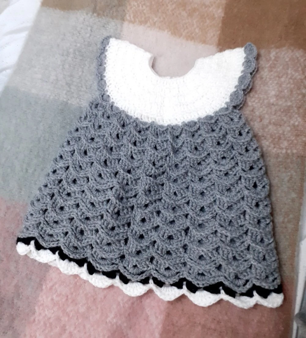 Robe bebe entierement crochetee a la main , en fil acrylique gris doux et chaud.