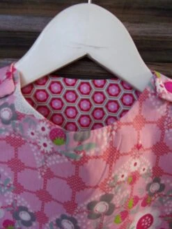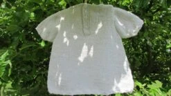 Voici une petite robe pour bébé réalisée à la main au crochet, avec différentes couleur de fil à tricoter. L’empiècement est uni. Un petit bouton ferme la robe derrière le cou.