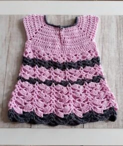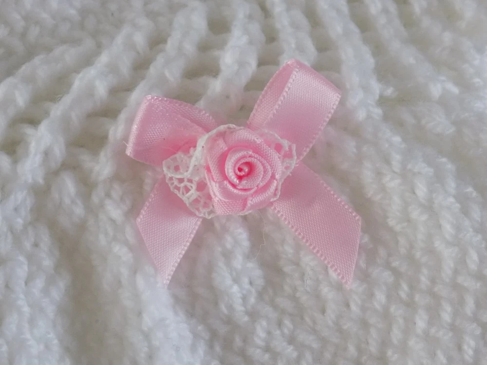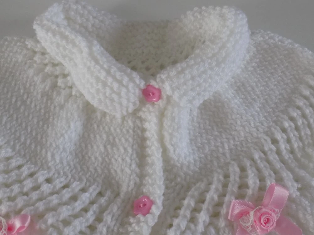 _Elle est tricotée au point de jersey torse , au point de mousse et dans un joli point fantaisie ajouré , manches courtes , col polo large pour ne pas gêner bébé au niveau du cou , elle se ferme devant par 3 boutons , forme fleur , de coloris rose pâle , de chaque côté j’ai cousu un noeud rose en satin avec au centre une petite rose , également en satin , avec dentelle blanche autour.