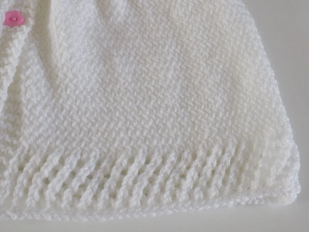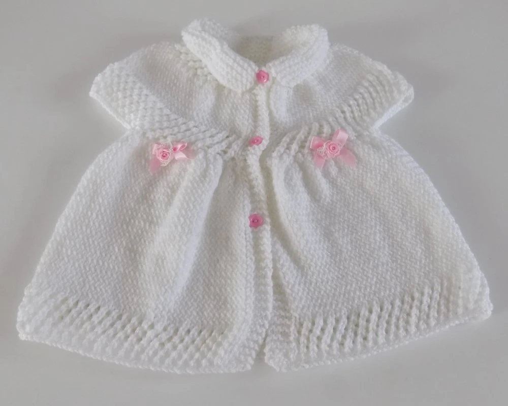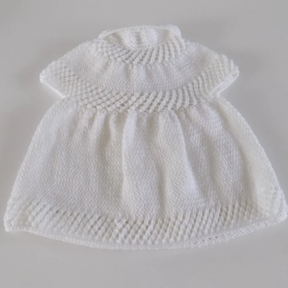 _Ravissante petite robe pour bébé réalisée à la main au tricot en laine acrylique , fils épais , de coloris blanc en taille 3 à 6 mois , selon le poids et la taille de l’enfant , pensez à vérifier les mensurations de bébé avant de commander.