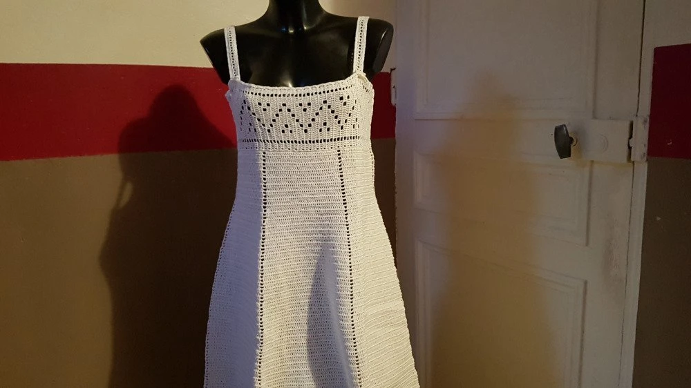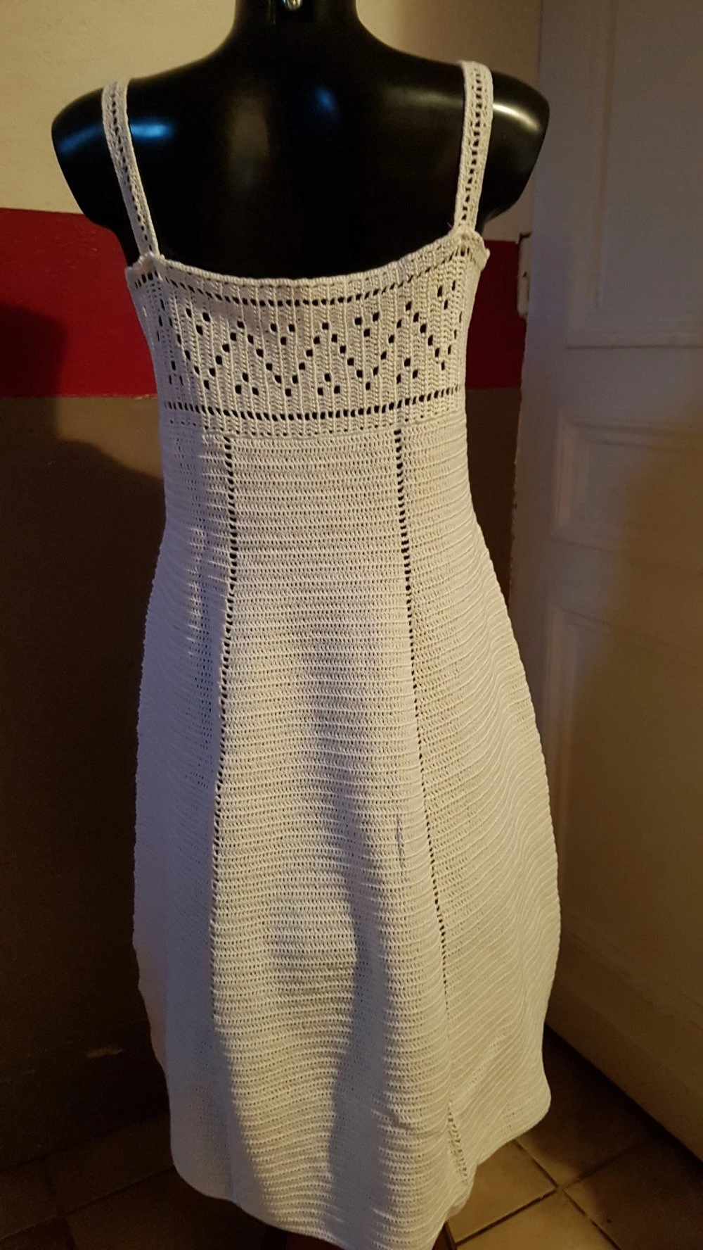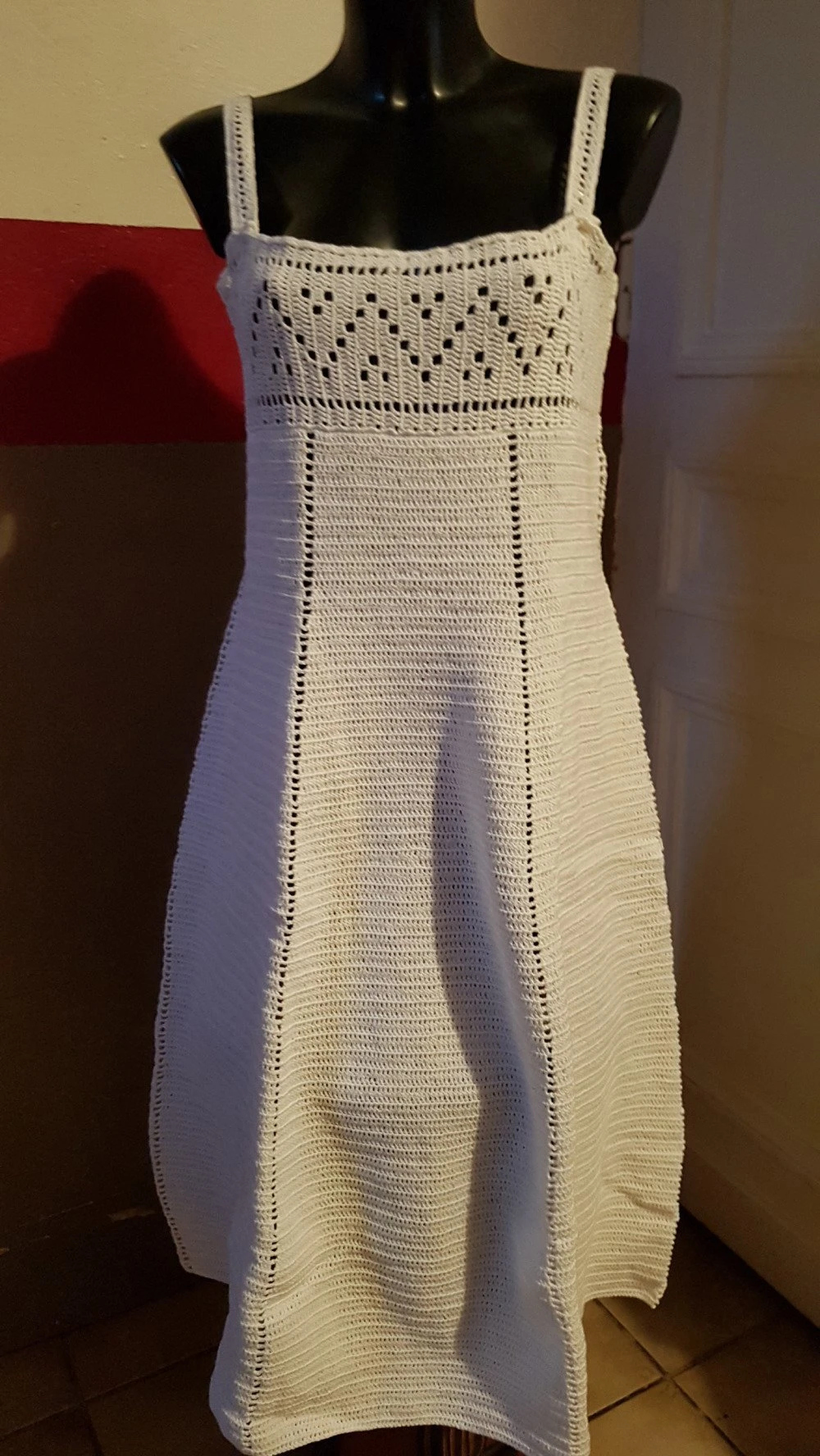 Robe pour femme, taille 42. couleur blanc, au crochet fait main. A bretelles, ligne fluide sans couture, corselet ajouré, légèrement évasée, avec 6 panneaux de brides séparés par une grille de 2 mailles en l’air. Elle est réalisée en qualité Sierra des 3 Suisses (100% coton mercerisé), crochet n° 2.