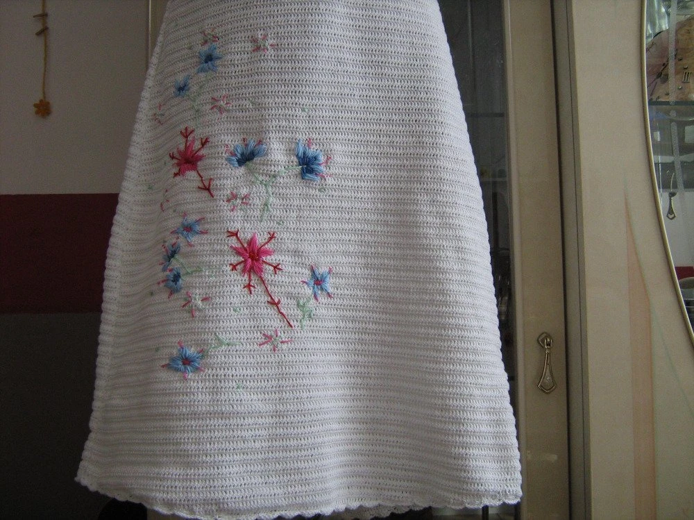 Robe à bretelles pour femme, taille 36/38, au crochet, réalisée en brides, le bas est arrondi, avec pinces poitrine, brodée sur le devant avec motif de fleurs. Longueur totale 100 cm, longueur sous aisselles 76 à 81 cm selon l’arrondi, largeur à la taille 36 cm, largeur aux hanches 50 cm.