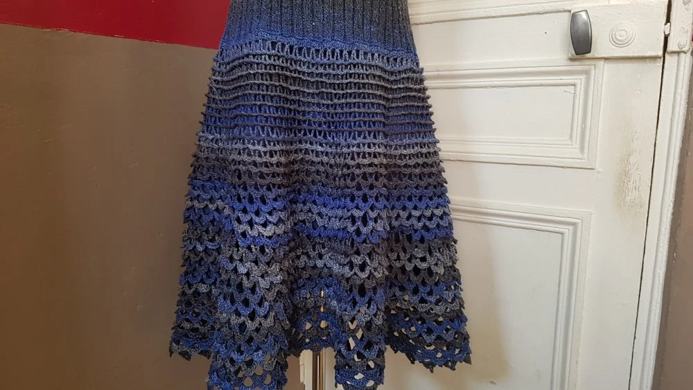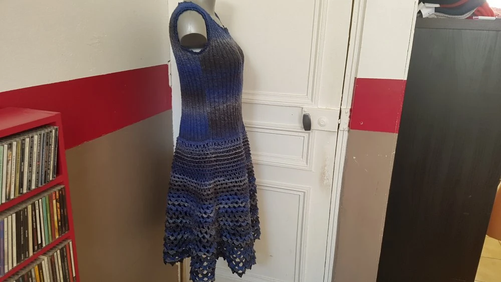 Voilà une robe d’été originale ! Elle est à la fois au tricot et au crochet. Le haut est un débardeur au tricot en côtes 3/2, avec finitions au crochet au point de picot. La jupe est ajourée, au crochet. Elle est doublée pour pouvoir la porter en toutes occasions.