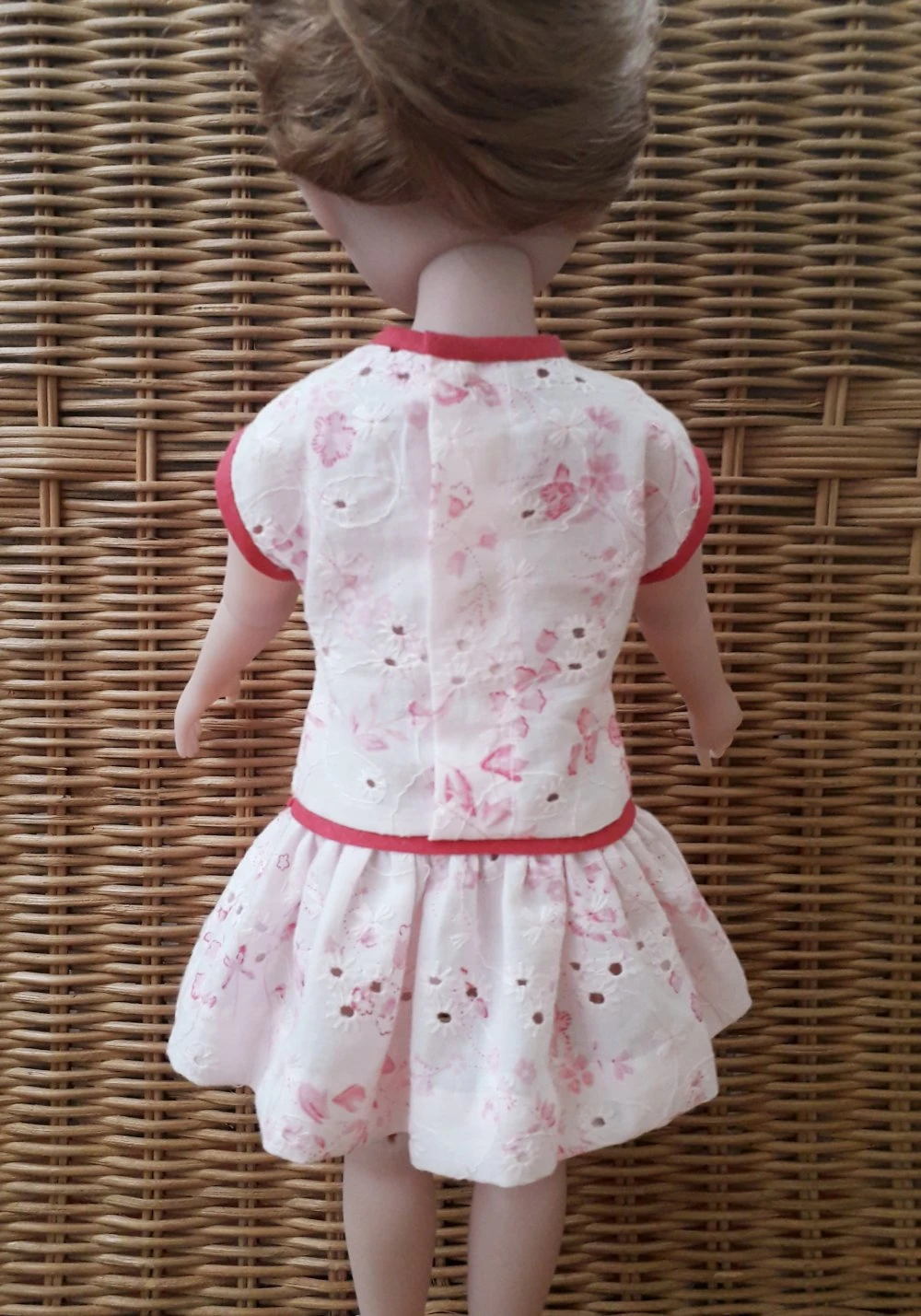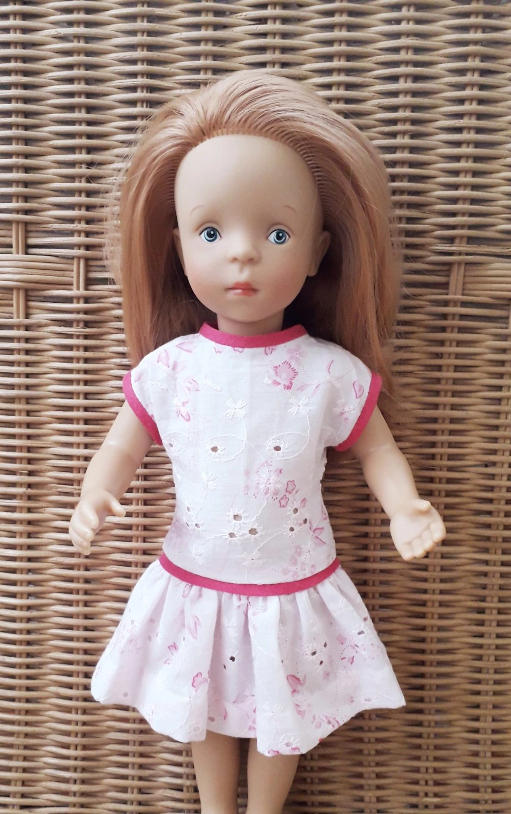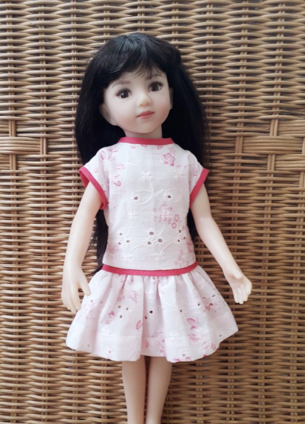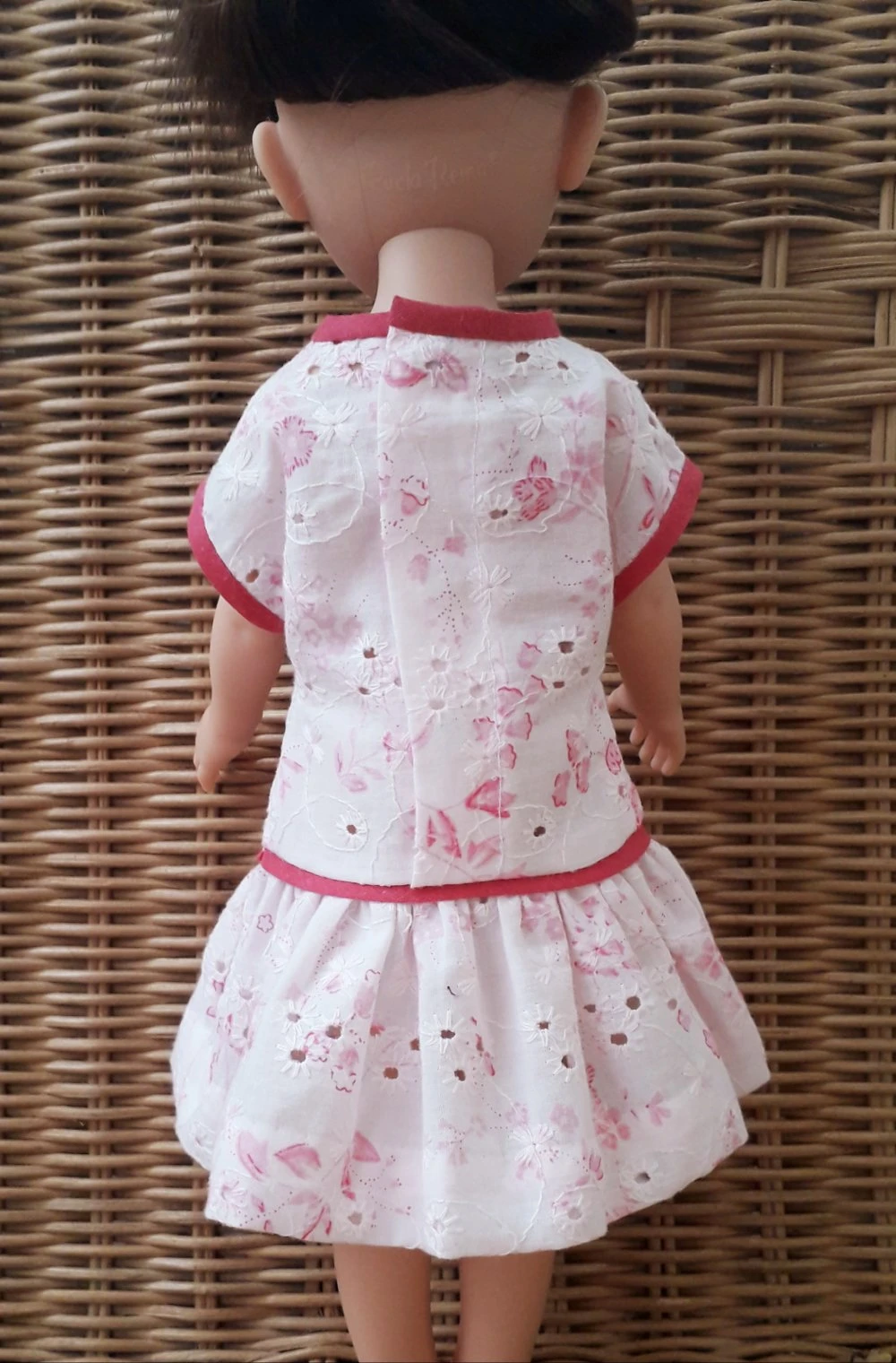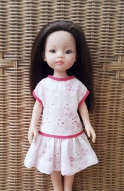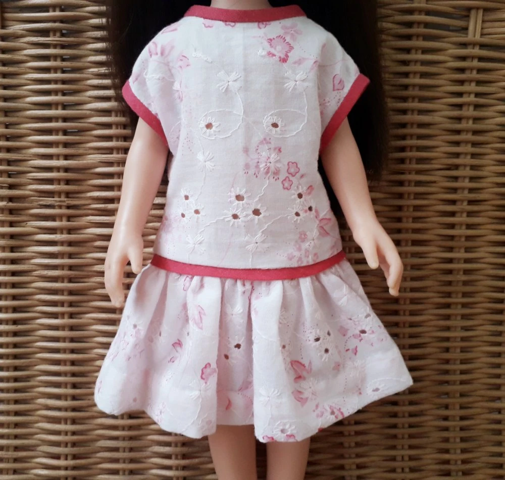 Robe rose pâle, impression fleurs rose fushia en magnifique tissu coton, broderie anglaise pour poupée 32-36 cm, compatible Little Darling et Mini Maru et Fashion Friends de Dianna Effner, Les Chéries de Corolle, Les Minouches de Sylvia Natterer, faite main, création personnelle réalisée par mes soins.