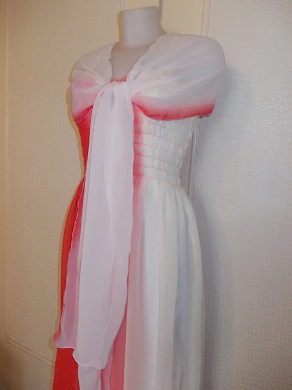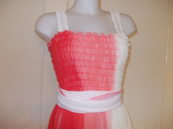 -Robe bustier smokée mi longue en mousseline tricolore,couleurs dégradés,rose orange et beige,avec bretelles beige elastiqué et petite dentelle.