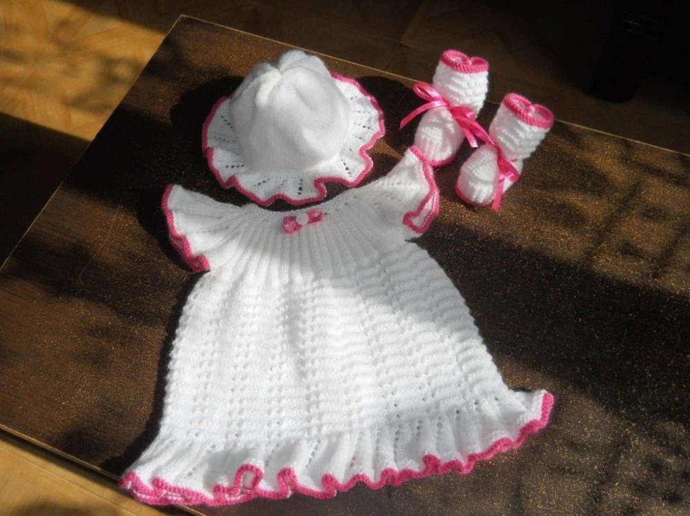 D’une robe aux manches courte avec volants froufrouté et fini d’un liseré rose elle est tricoté dans un joli point fantaisie,et est entièrement boutonné dans le dos par 5 petits boutons,le bas de la robe est terminé par le même volant froufrouté que les manches,un petit nœud est cousu sur le devant .