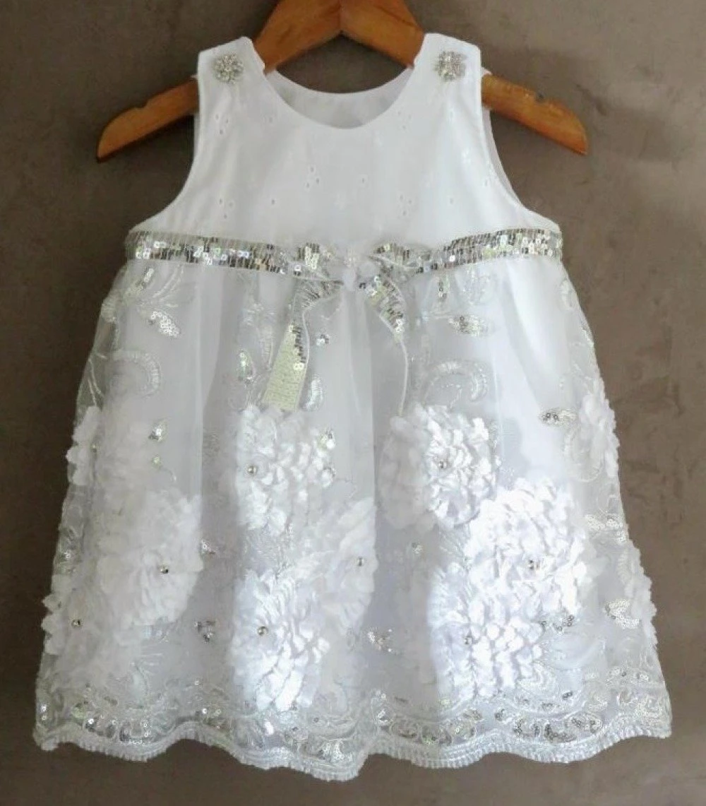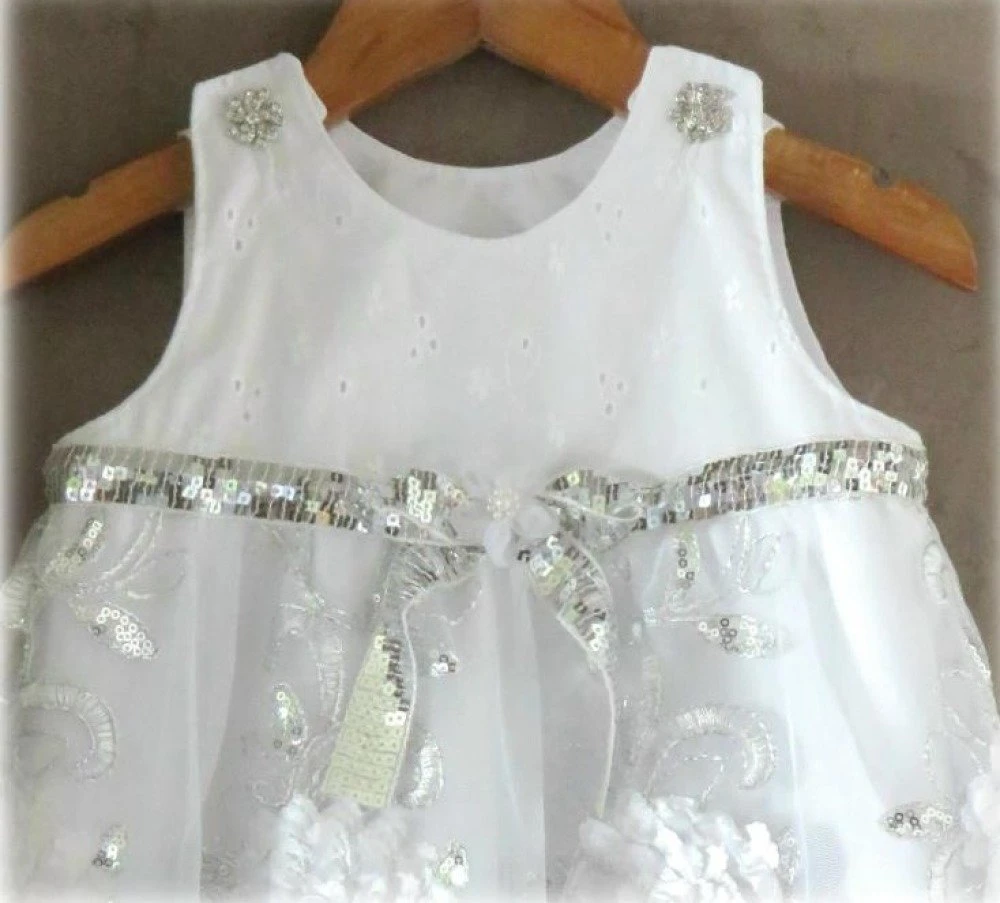 Elle est confectionnée avec un tissu de coton en broderie anglaise pour le haut et une superbe dentelle de tulle agrémenté de fleurs blanches et de perles argentées pour le bas, doublée de coton blanc.