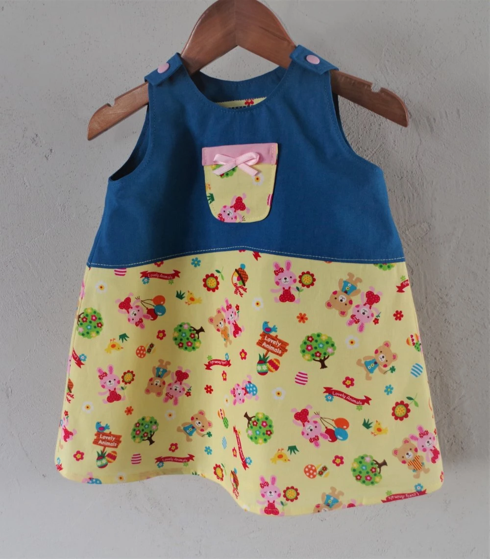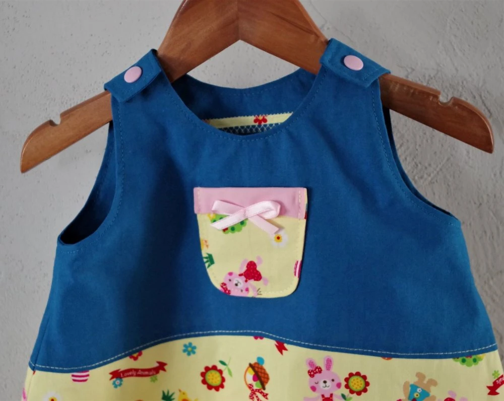 Robe chasuble forme trapèze confectionnée avec des tissus de coton, bleu et jaune à motifs enfantins.