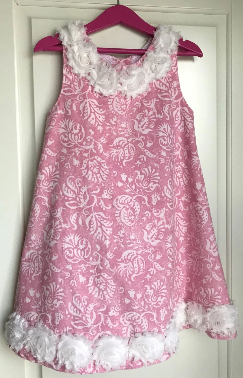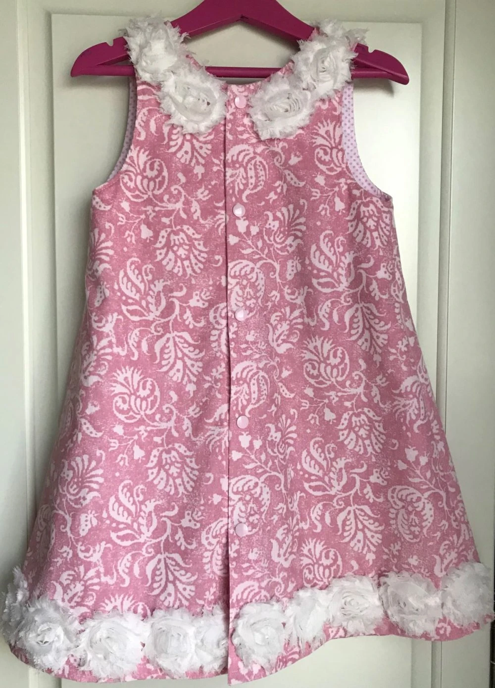 Robe chasuble forme trapèze confectionnée avec un joli velours de coton rose à motifs fleuris, avec parementure intérieure en coton à pois dans les mêmes tons.