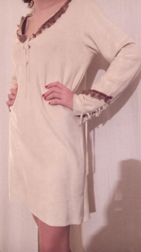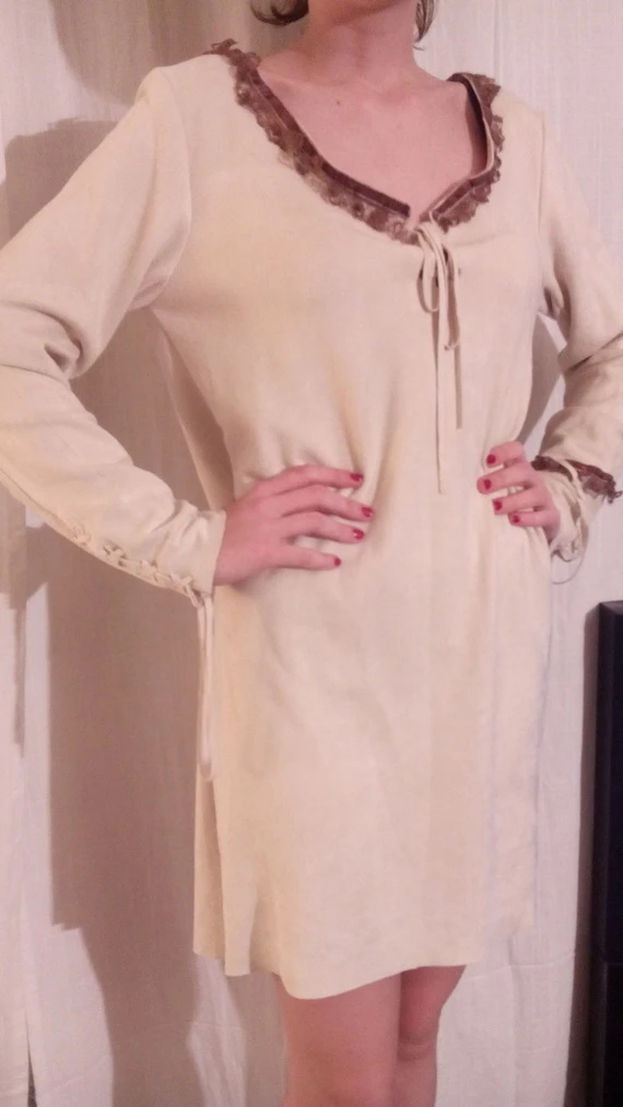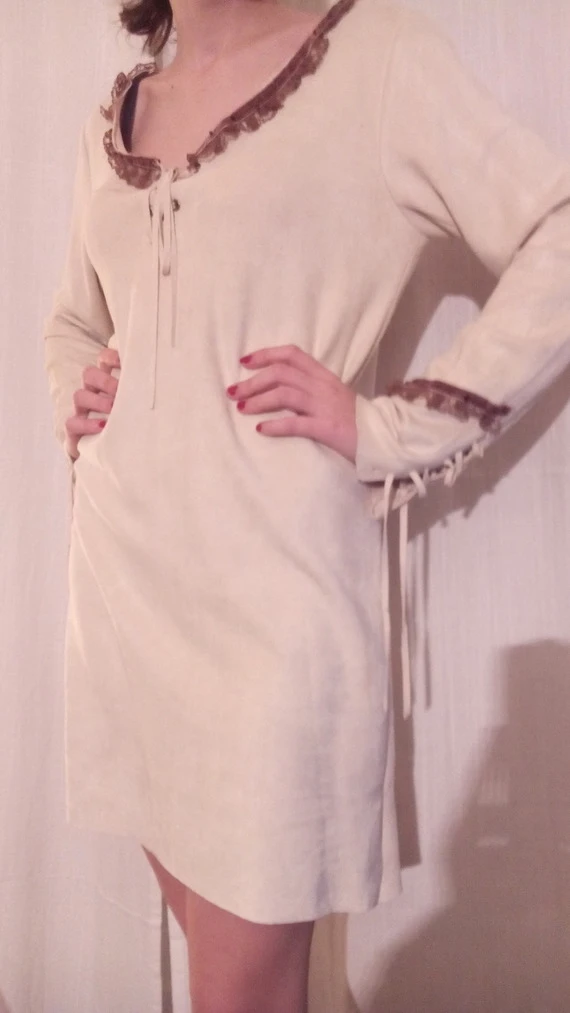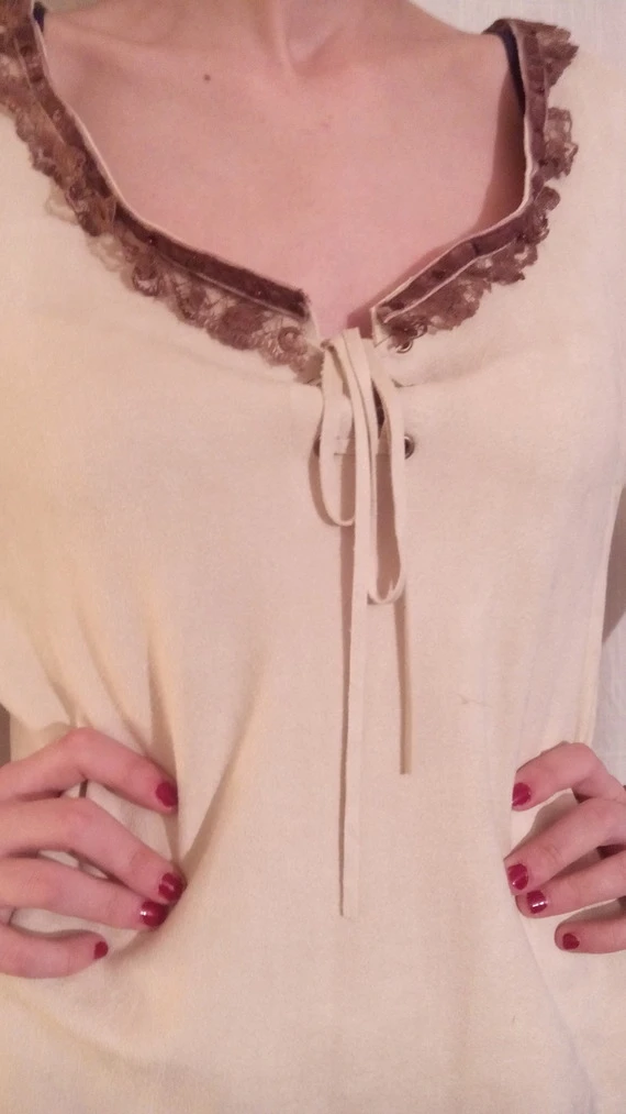 Col rond et attaché avec un lien et décoré d-un galon en suédine marron
