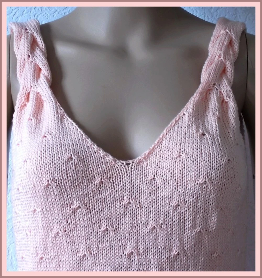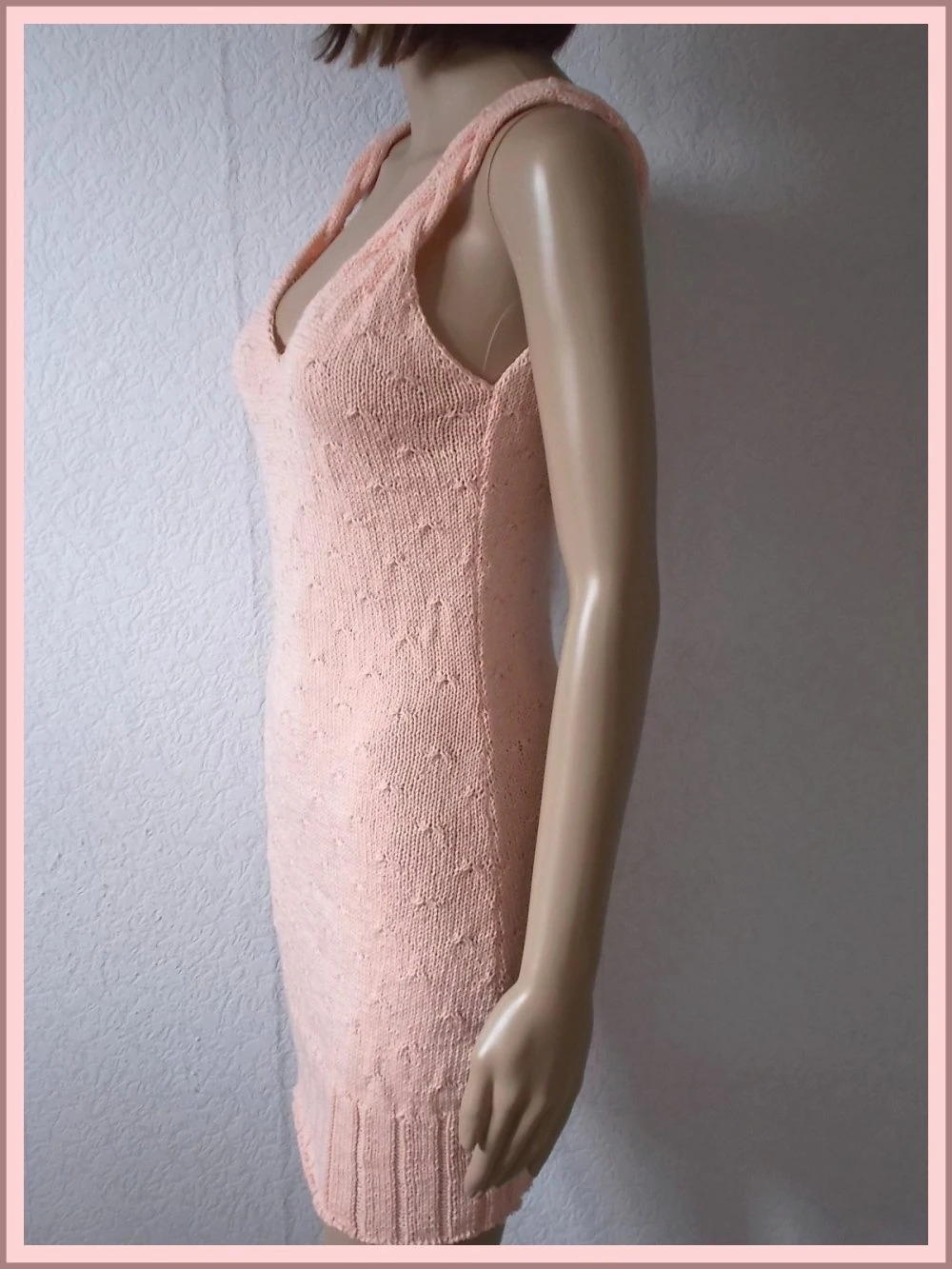 Robe courte à décolleté V dos et devant, bretelles torsadées, tricotée main au point fantaisie en fil 50 % coton et 50 % acrylique coloris Chamallow.