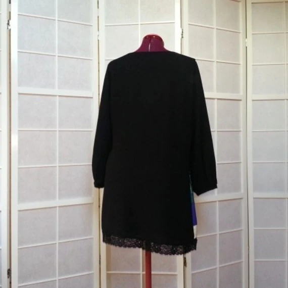 Tunique longue ou robe courte réalisée avec des tissus en viscose noir et polyester imprimé.
