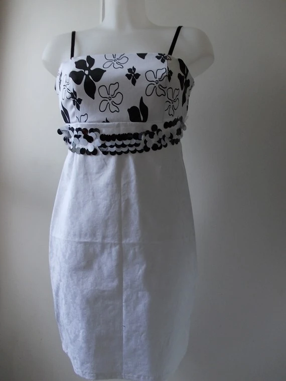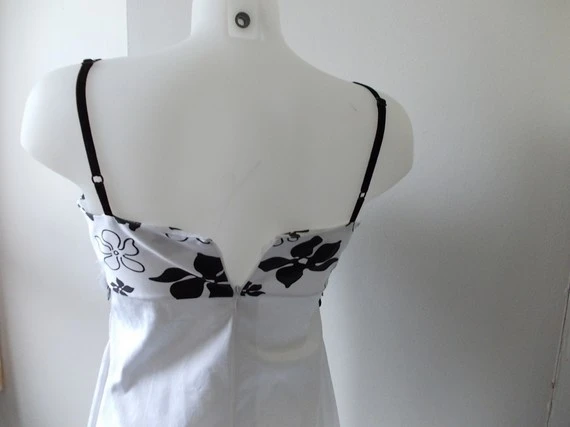 Robe d’étè en coton blanche-noir ,bustier imprimé de fleurs de tréfle noires.