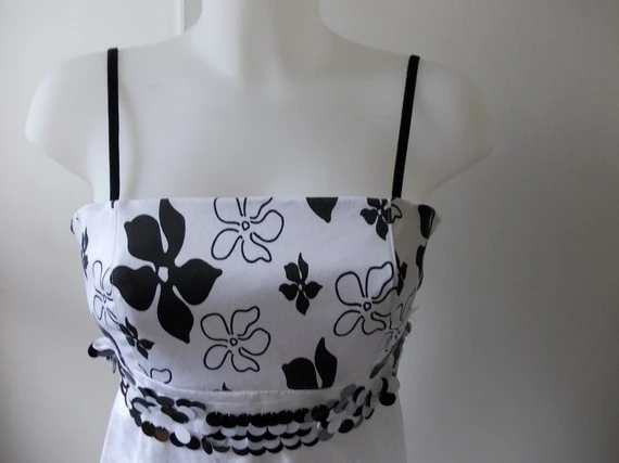 Petite cinture en ruban blanc avec des petits sequins blancs et noirs,qui s’atache par deux liens a nouer a l’ arriére,bretelles noires réglables.