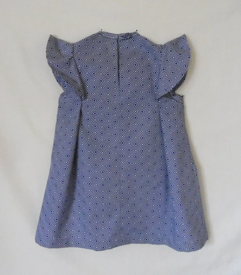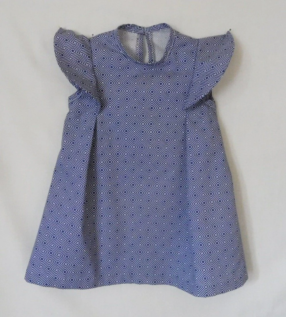 Jolie couleur bleu marine à lignes blanches, cette petite robe mesure 44 cm de l’épaule jusqu’en bas, dessus d’épaule en volant froufrou.