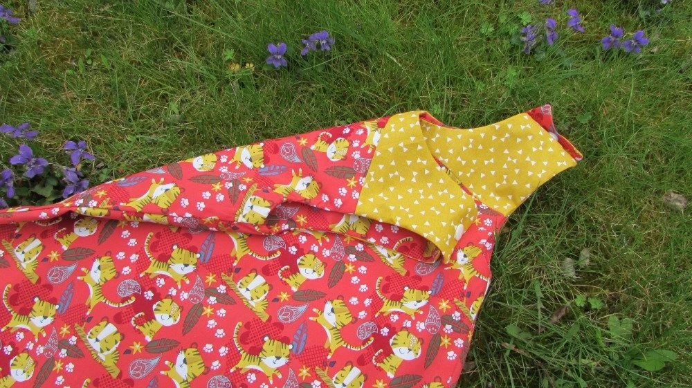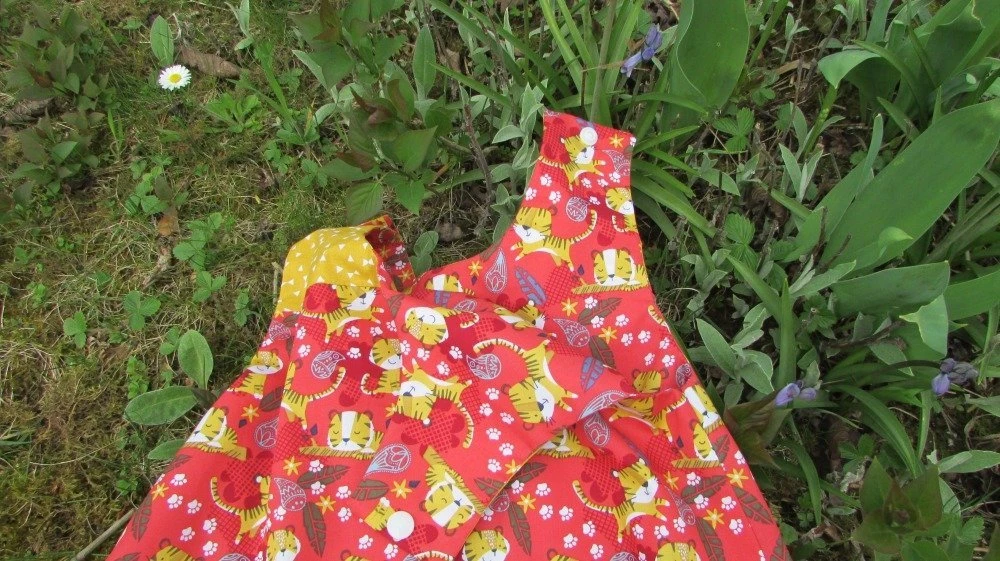 Robe d’été en tissu imprimé coton, couleur rouge orangé et rouge framboise avec des petits lions jaunes. Empiècement jaune devant et dos. Fermeture aux épaules par 2 boutons pressions. Haut de la robe doublé par le tissu imprimé. Facile à enfiler, facile d’entretien,( 40 degrés en machine), indispensable pour l’été. Peut se porter avec un tee-shirt dessous ou sans rien pour les journées chaudes . Taille 2 ans.